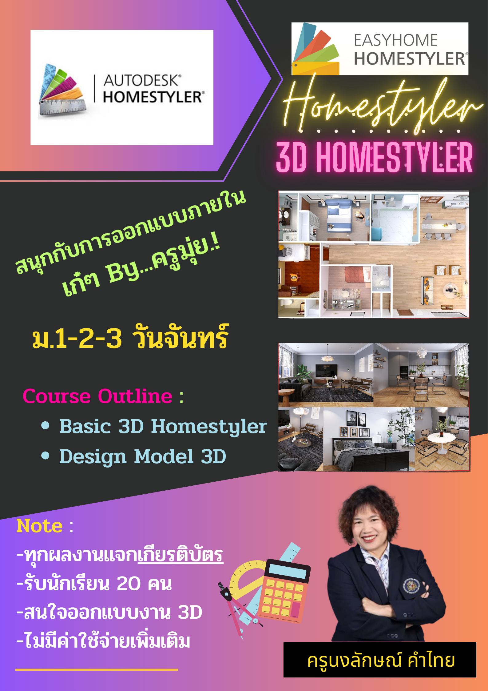 ชื่อวิชา : 3D Homestyler สนุกกับการออกแบบภายในรุ่นเยาว์..กัน ครูผู้สอน : นงลักษณ์ คำไทย ระดับชั้นที่เปิดสอน : ม.1 ม.2 ม.3 ดูรายละเอียดเพิ่มเติม.. |