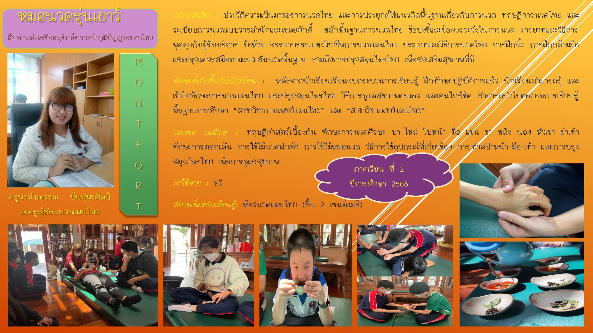 ชื่อวิชา : นวดแผนไทย & ปรุงสมุนไพรไทย ครูผู้สอน : พรนับพรรณ ปันตี ระดับชั้นที่เปิดสอน : ม.1 ม.2 ม.3 ดูรายละเอียดเพิ่มเติม.. |