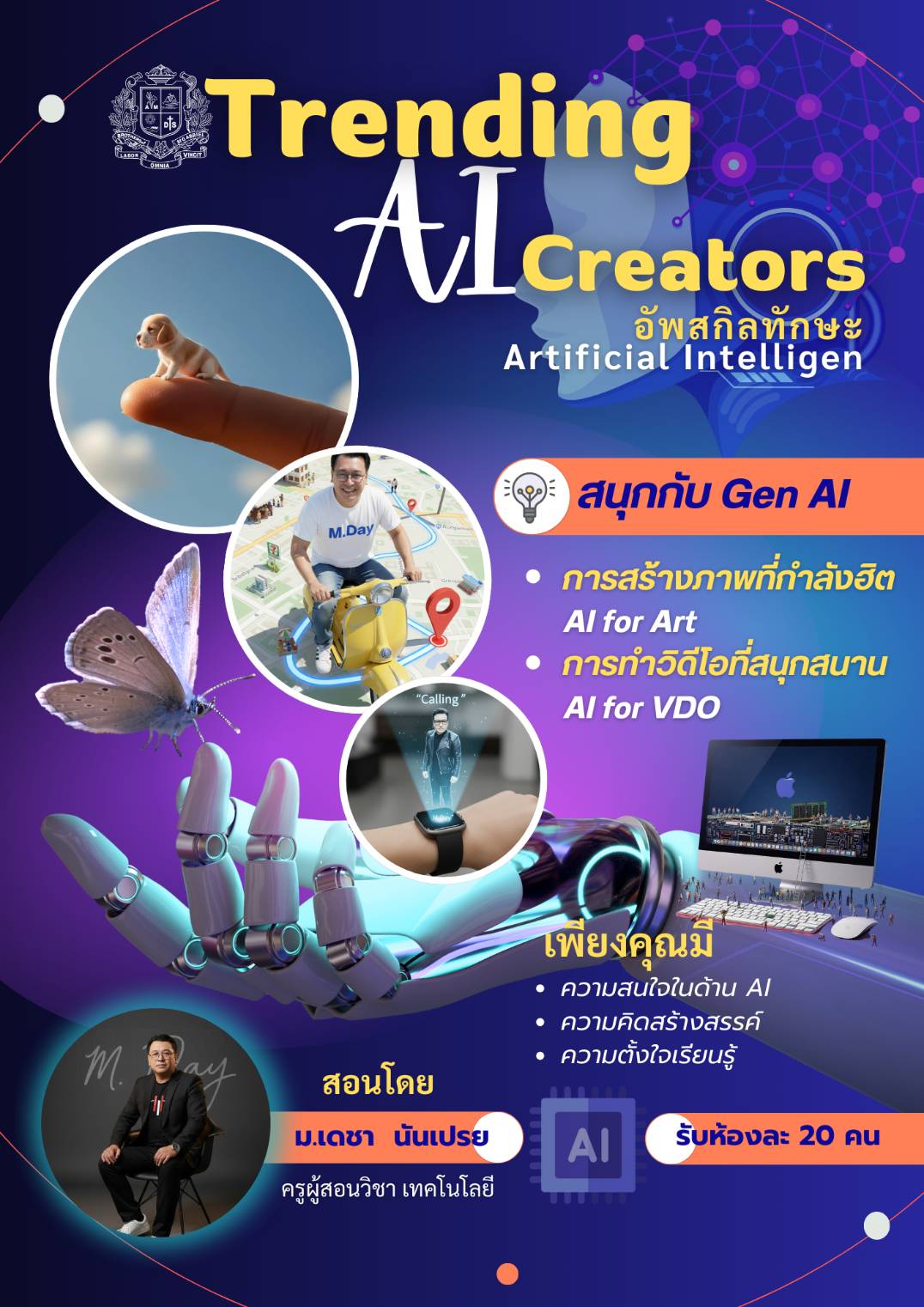 ชื่อวิชา : Trending AI Creators ครูผู้สอน : เดชา นันเปรย ระดับชั้นที่เปิดสอน : ม.1 ม.2 ม.3 ดูรายละเอียดเพิ่มเติม.. |