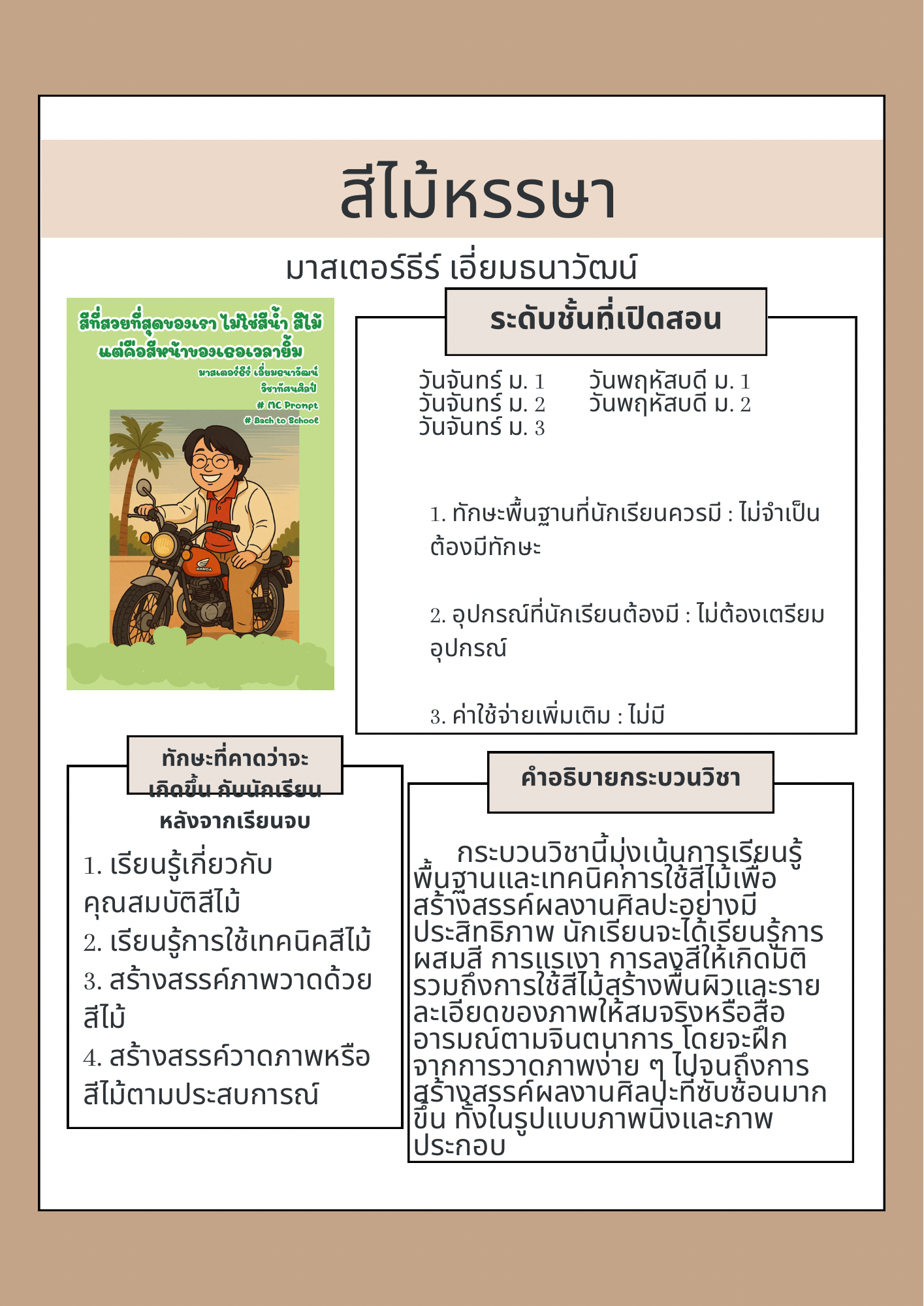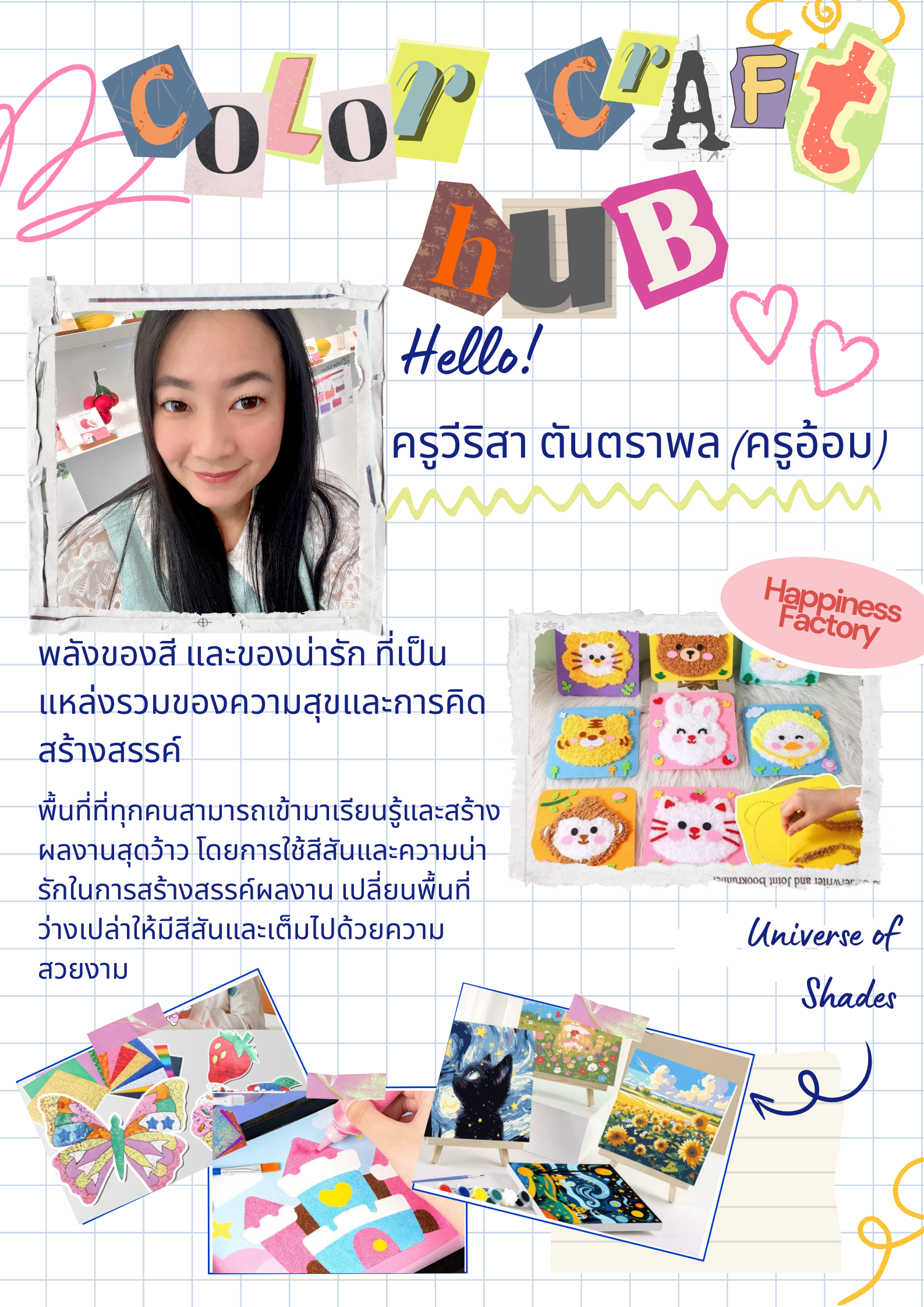 ชื่อวิชา : Color Craft Hub ครูผู้สอน : วีริสา ตันตราพล ระดับชั้นที่เปิดสอน : ม.1 ม.2 ม.3 ดูรายละเอียดเพิ่มเติม.. | Food and Beverage |