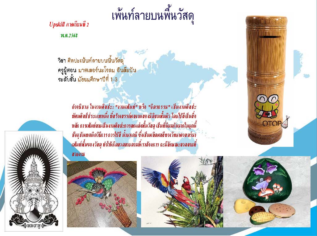 ชื่อวิชา : เพ้นท์ลายบนพื้นวัสดุ ครูผู้สอน : นะโรดม อินต๊ะปัน ระดับชั้นที่เปิดสอน : ม.1 ม.2 ม.3 ดูรายละเอียดเพิ่มเติม.. |