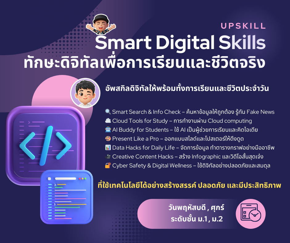 ชื่อวิชา : Smart Digital Skills: ทักษะดิจิทัลเพื่อการเรียนและชีวิตจริง ครูผู้สอน : พีรพงษ์ บัวเหลือง ระดับชั้นที่เปิดสอน : ม.1 ม.2 ดูรายละเอียดเพิ่มเติม.. |