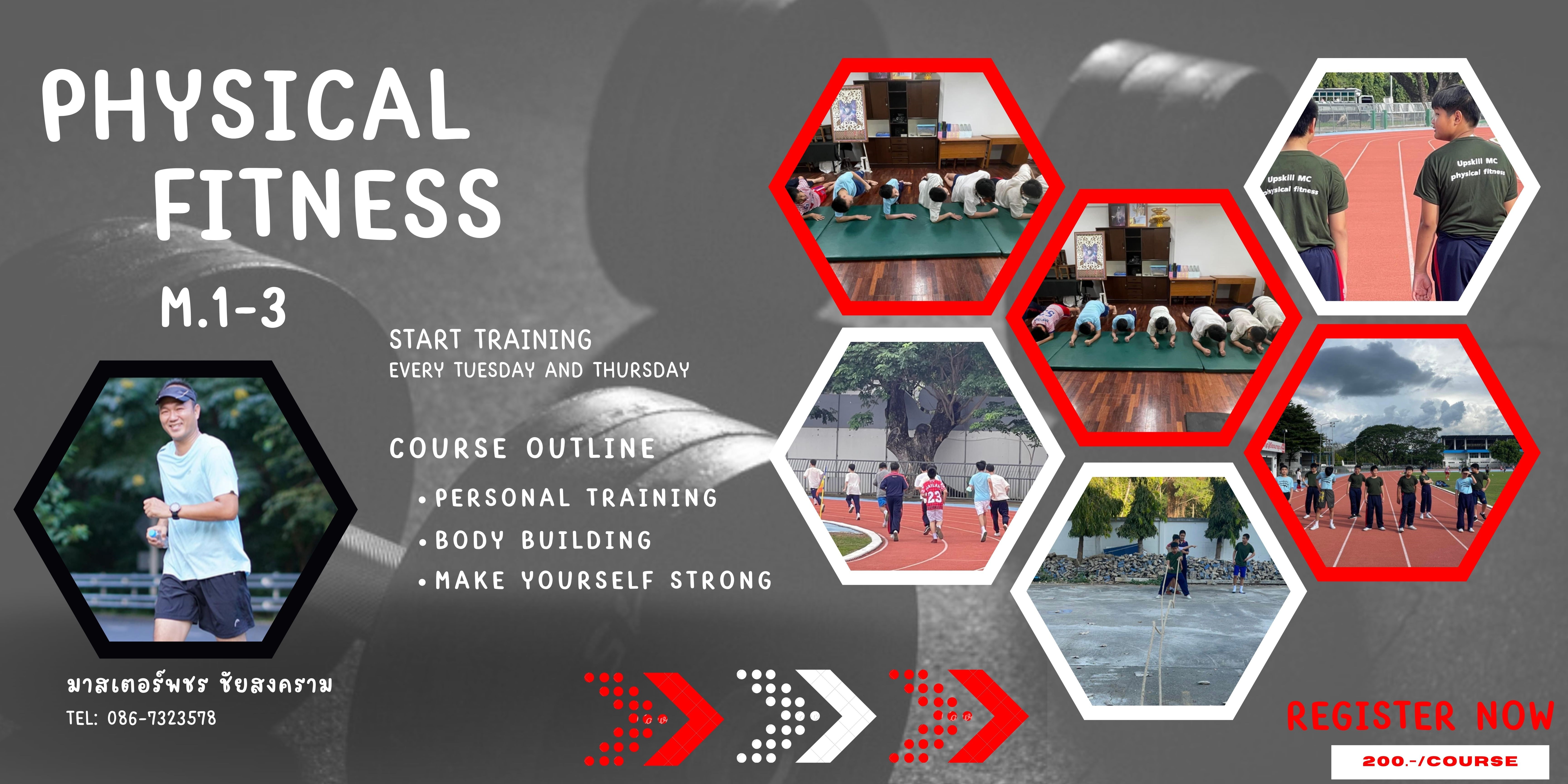 ชื่อวิชา : สมรรถภาพทางกาย physical training ครูผู้สอน : พชร ชัยสงคราม ระดับชั้นที่เปิดสอน : ม.1 ม.2 ม.3 ดูรายละเอียดเพิ่มเติม.. |