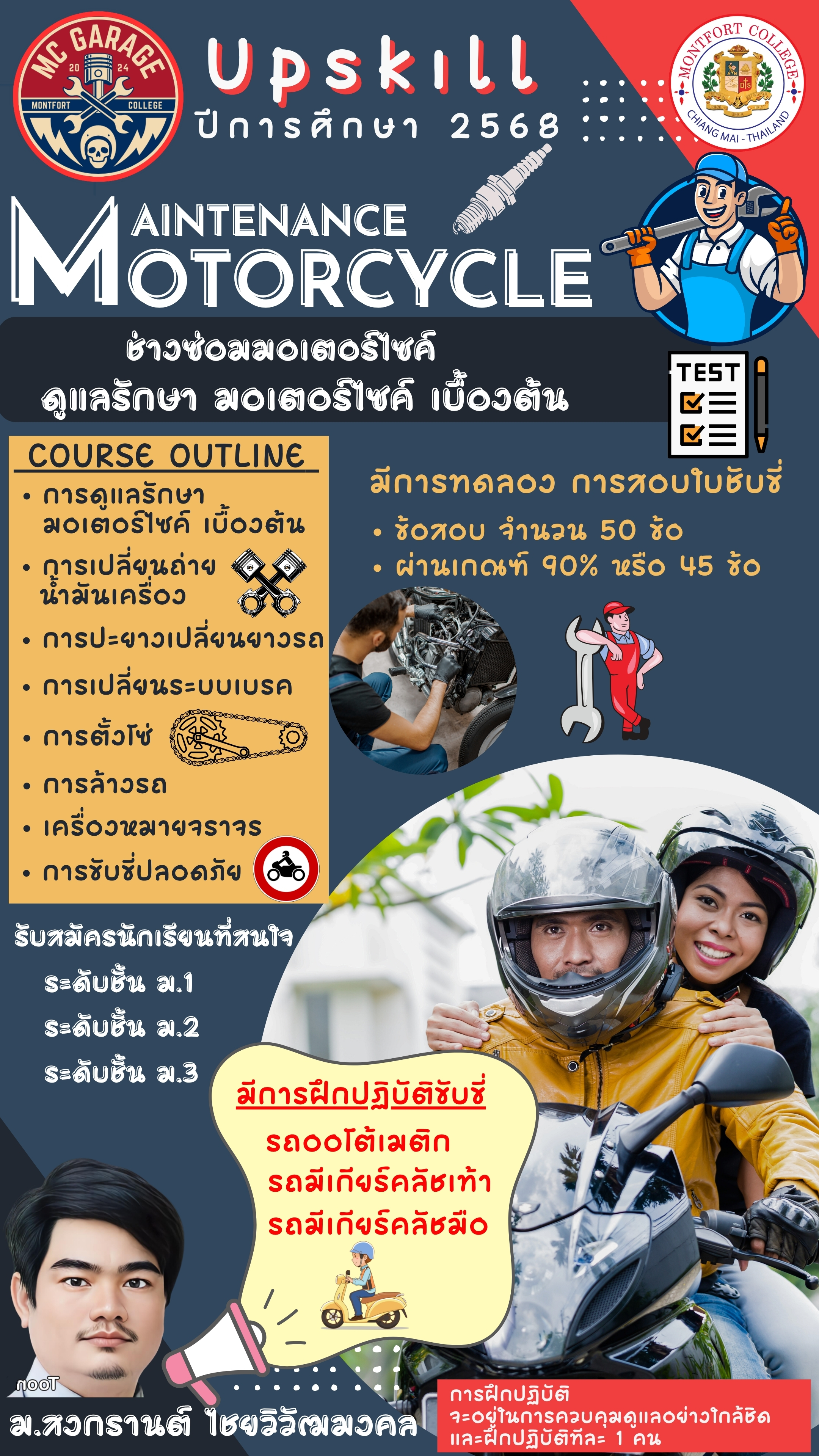 ชื่อวิชา : ช่างซ่อมมอเตอร์ไซค์ ครูผู้สอน : สงกรานต์ ไชยวิวัฒน์มงคล ระดับชั้นที่เปิดสอน : ม.1 ม.2 ม.3 ดูรายละเอียดเพิ่มเติม.. |