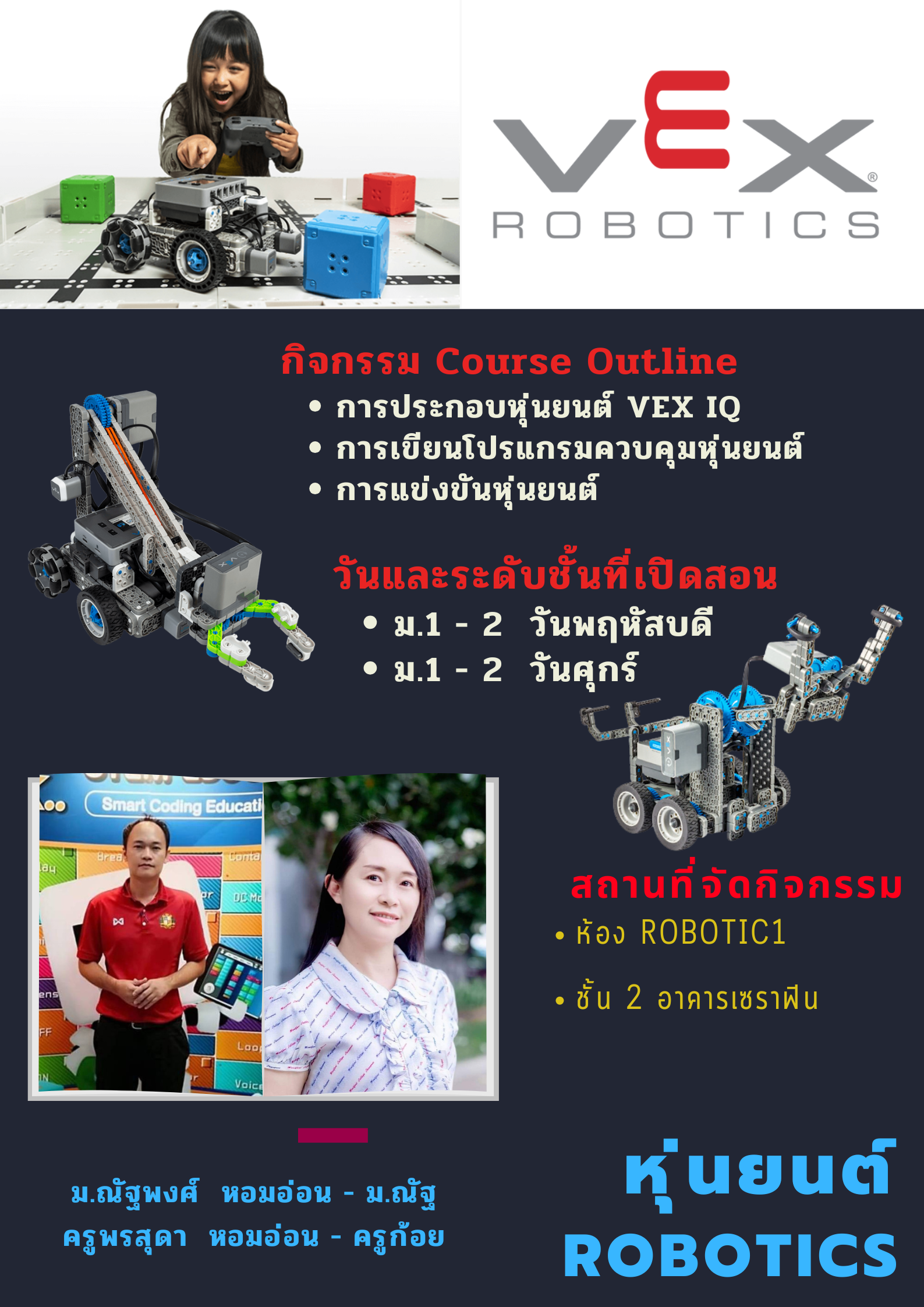 ชื่อวิชา : หุ่นยนต์ - Robotics ครูผู้สอน : พรสุดา หอมอ่อน ระดับชั้นที่เปิดสอน : ม.1 ม.2 ดูรายละเอียดเพิ่มเติม.. | Science-Math |