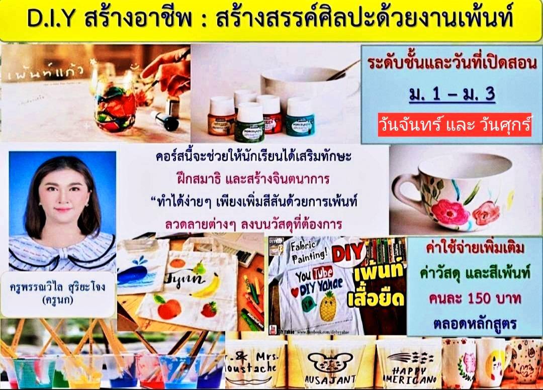 ชื่อวิชา : D.I.Y สร้างอาชีพ : สร้างสรรค์ศิลปะด้วยงานเพ้นท์ ครูผู้สอน : พรรณวิไล สุริยะโจง ระดับชั้นที่เปิดสอน : ม.1 ม.2 ม.3 ดูรายละเอียดเพิ่มเติม.. |
