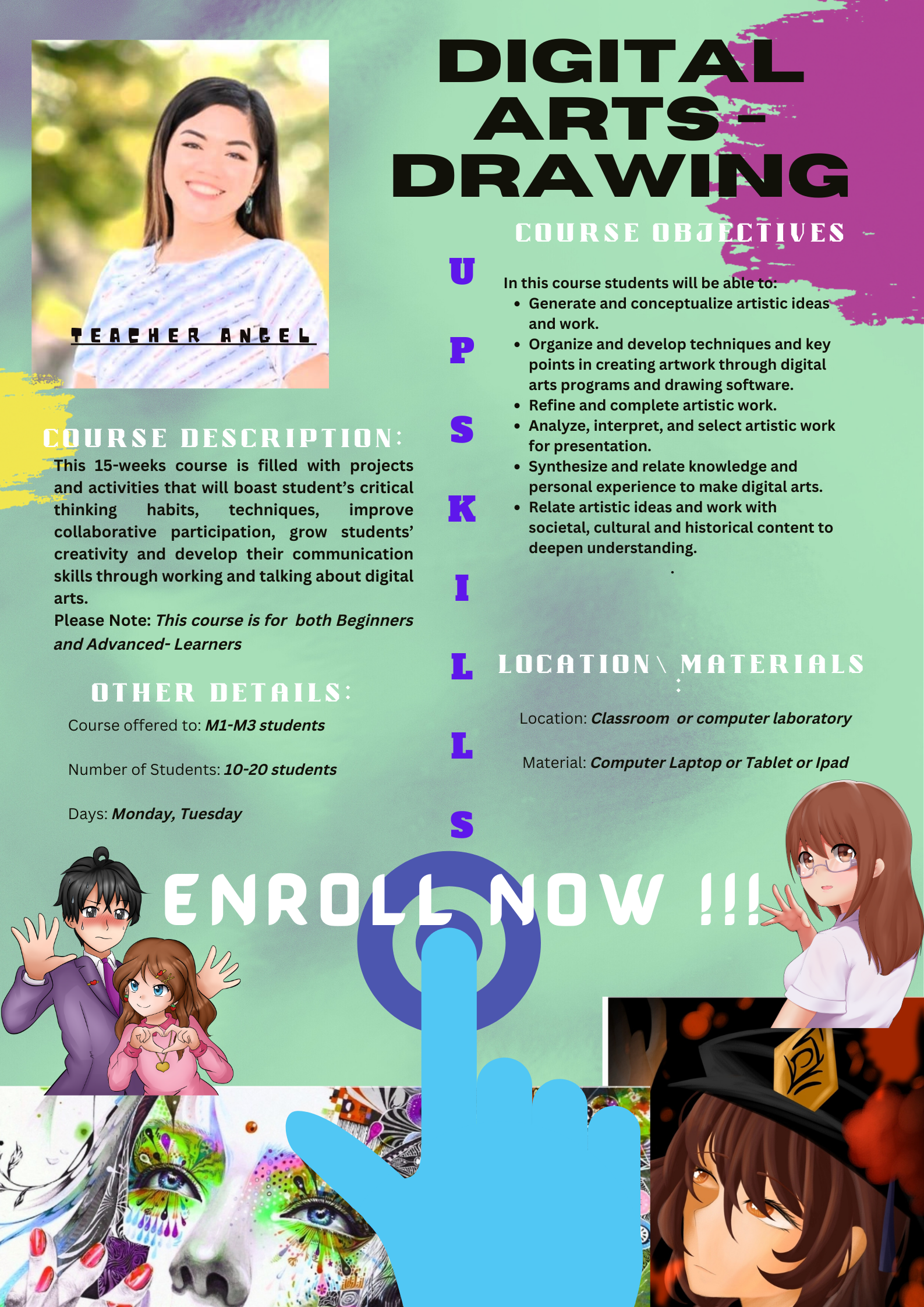ชื่อวิชา : DIGITAL ARTS DRAWING ครูผู้สอน : Angelica Watiwat Manalo ระดับชั้นที่เปิดสอน : ม.1 ม.2 ม.3 ดูรายละเอียดเพิ่มเติม.. |