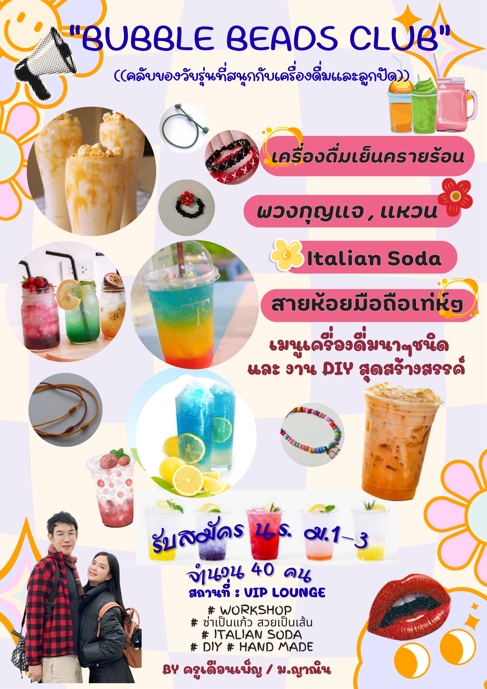 ชื่อวิชา : “Bubble Beads Club” (คลับของวัยรุ่นที่สนุกกับเครื่องดื่มและร้อยลูกปัด) ครูผู้สอน : ญาณิน ศิริไพศาลประเสริฐ ระดับชั้นที่เปิดสอน : ม.1 ม.2 ม.3 ดูรายละเอียดเพิ่มเติม.. |