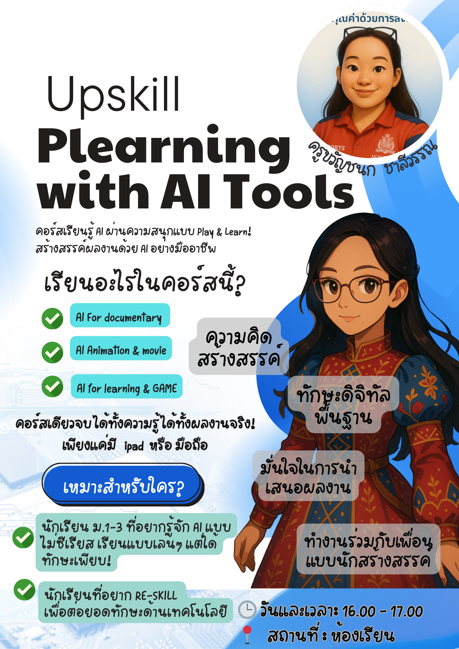 ชื่อวิชา : Plearning with AI Tools (AI ผ่านความสนุกแบบ Play & Learn!) ครูผู้สอน : ขวัญชนก ชาลีวรรณ ระดับชั้นที่เปิดสอน : ม.1 ม.2 ม.3 ดูรายละเอียดเพิ่มเติม.. |