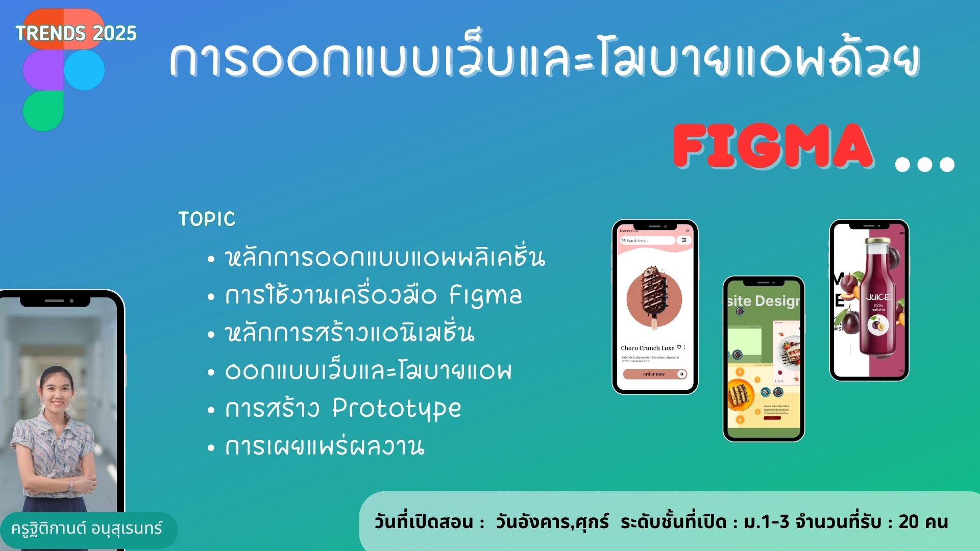 ชื่อวิชา : การออกแบบเว็บและโมบายแอพด้วย Figma ครูผู้สอน : ฐิติกานต์ อนุสุเรนทร์ ระดับชั้นที่เปิดสอน : ม.1 ม.2 ม.3 ดูรายละเอียดเพิ่มเติม.. |