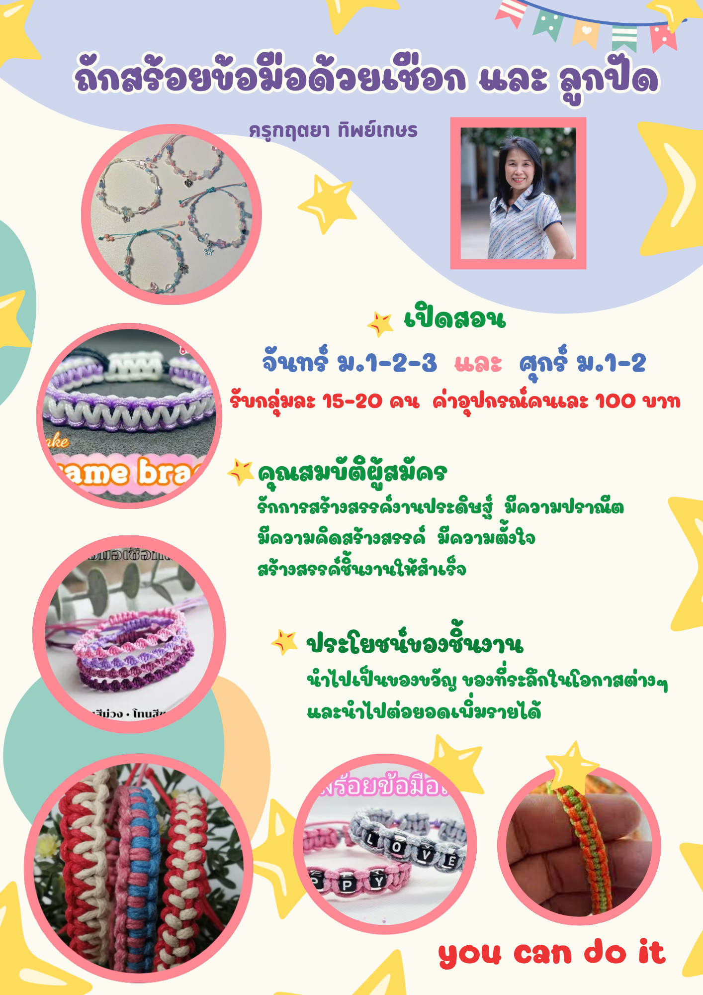 ชื่อวิชา : ถักสร้อยข้อมือด้วยเชือก และ ลุกปัด ครูผู้สอน : กฤตยา ทิพย์เกษร ระดับชั้นที่เปิดสอน : ม.1 ม.2 ม.3 ดูรายละเอียดเพิ่มเติม.. |