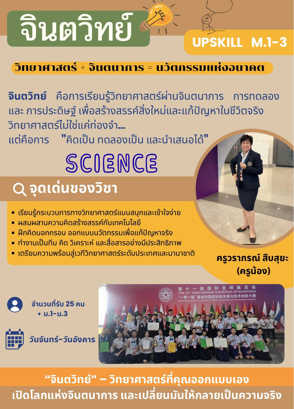 ชื่อวิชา : จินตวิทย์ ครูผู้สอน : วราภรณ์ สืบสุยะ ระดับชั้นที่เปิดสอน : ม.1 ม.2 ม.3 ดูรายละเอียดเพิ่มเติม.. |