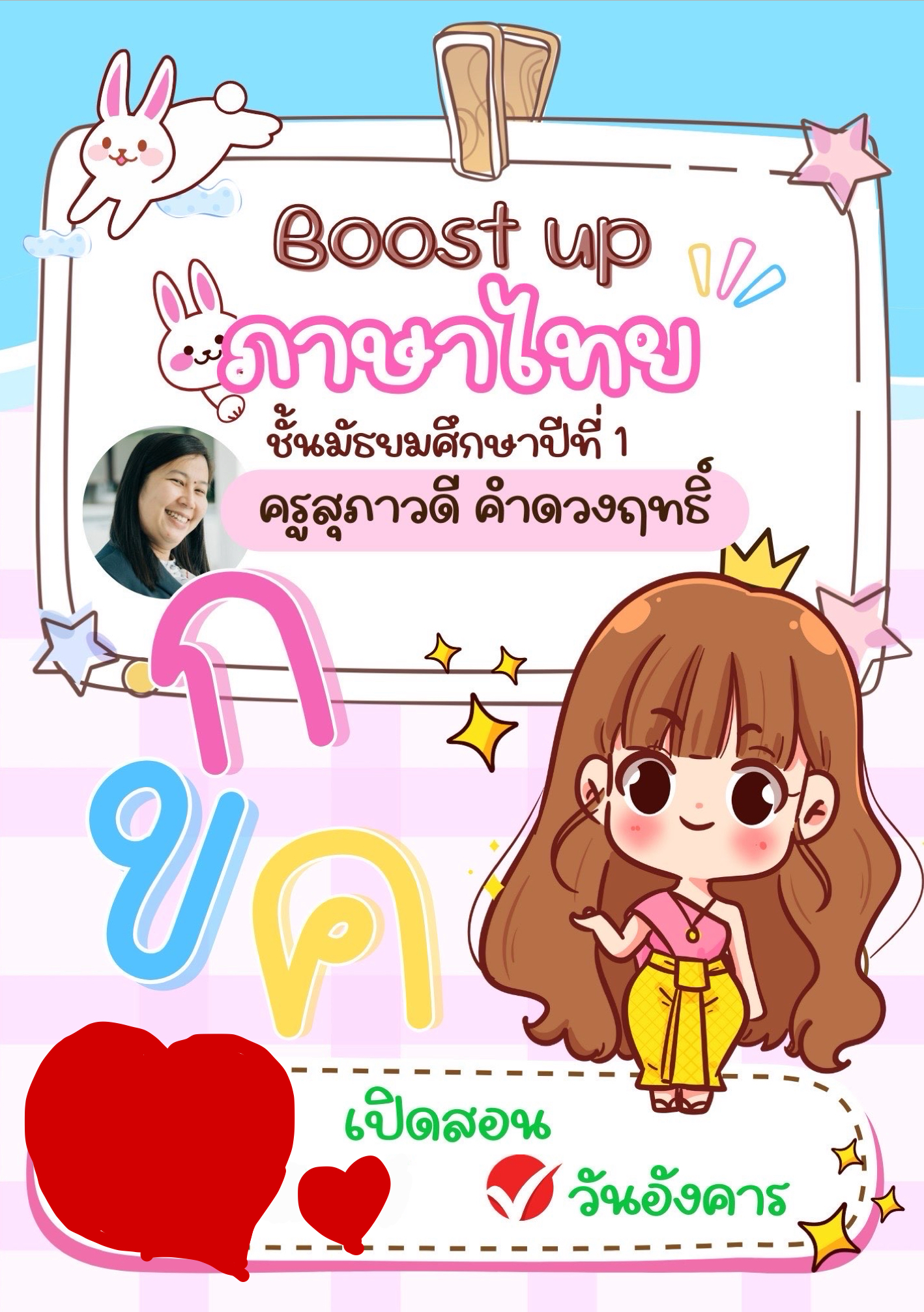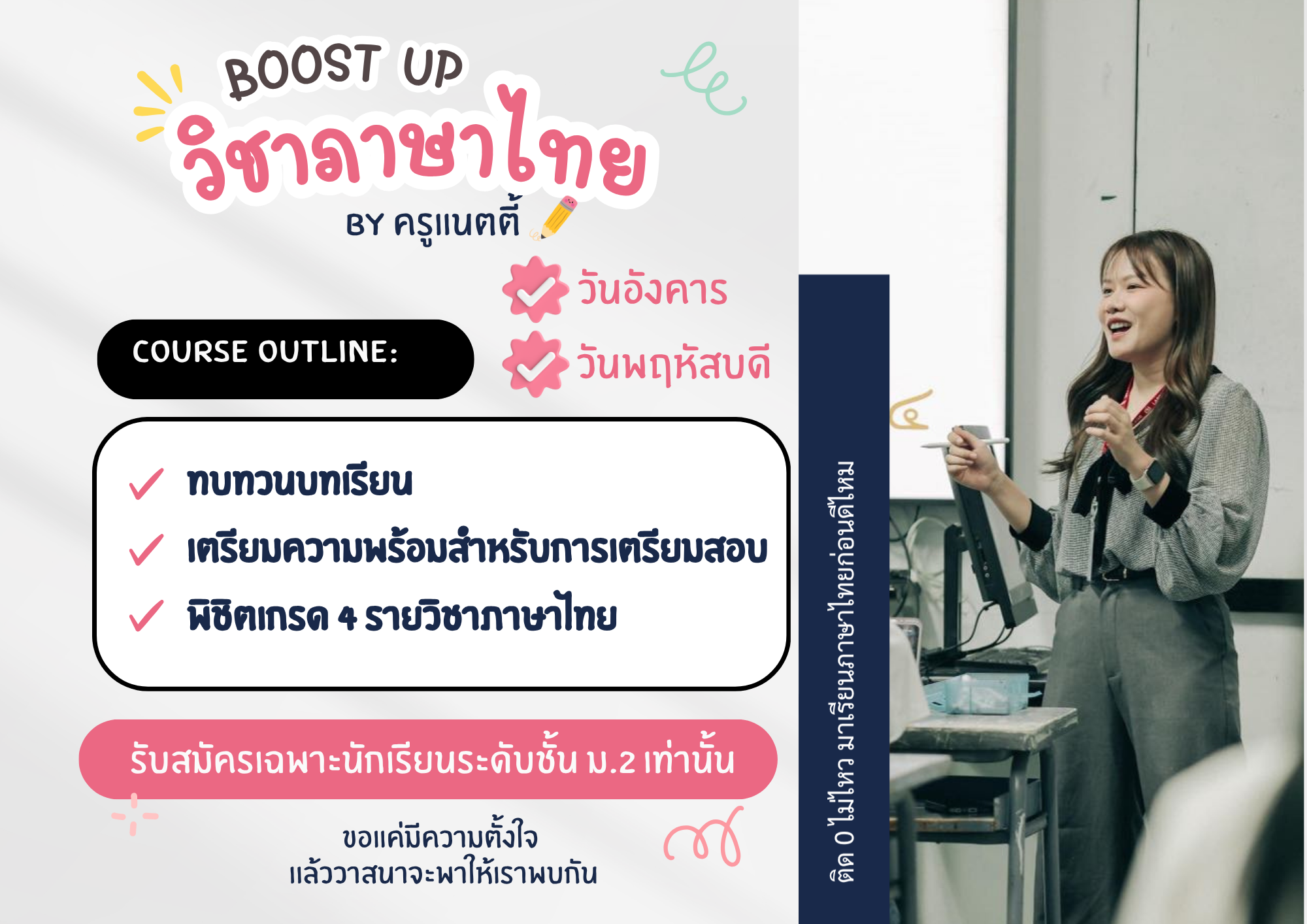 ชื่อวิชา : ิBoost up วิชาภาษาไทย ครูผู้สอน : สิรินาฎ จอมสวรรค์ ระดับชั้นที่เปิดสอน : ม.2 ดูรายละเอียดเพิ่มเติม.. |