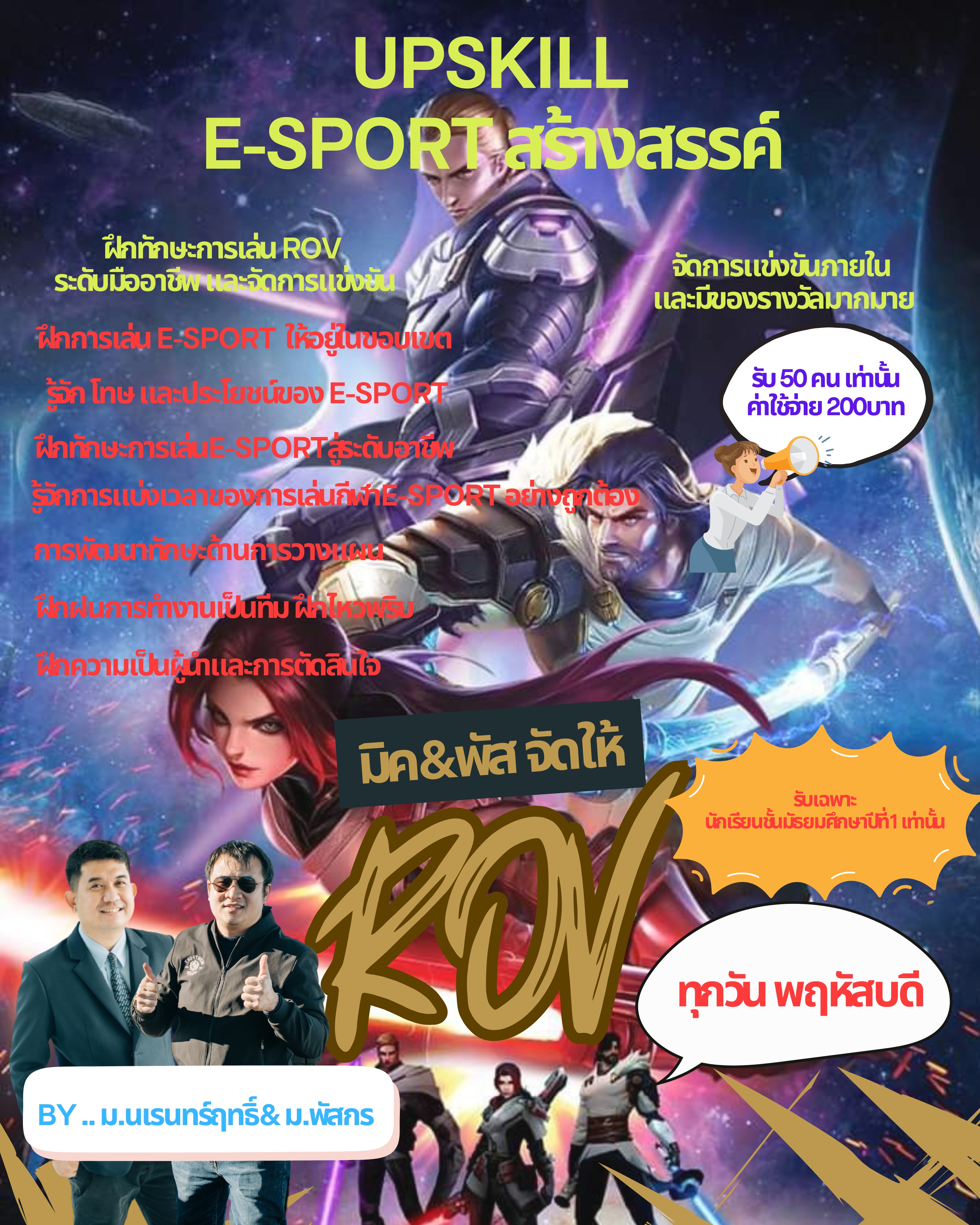 ชื่อวิชา : E-Sport สร้างสรรค์ (ROV) ครูผู้สอน : นเรนทร์ฤทธิ์ ต๊ะต้องใจ ระดับชั้นที่เปิดสอน : ม.1 ดูรายละเอียดเพิ่มเติม.. |