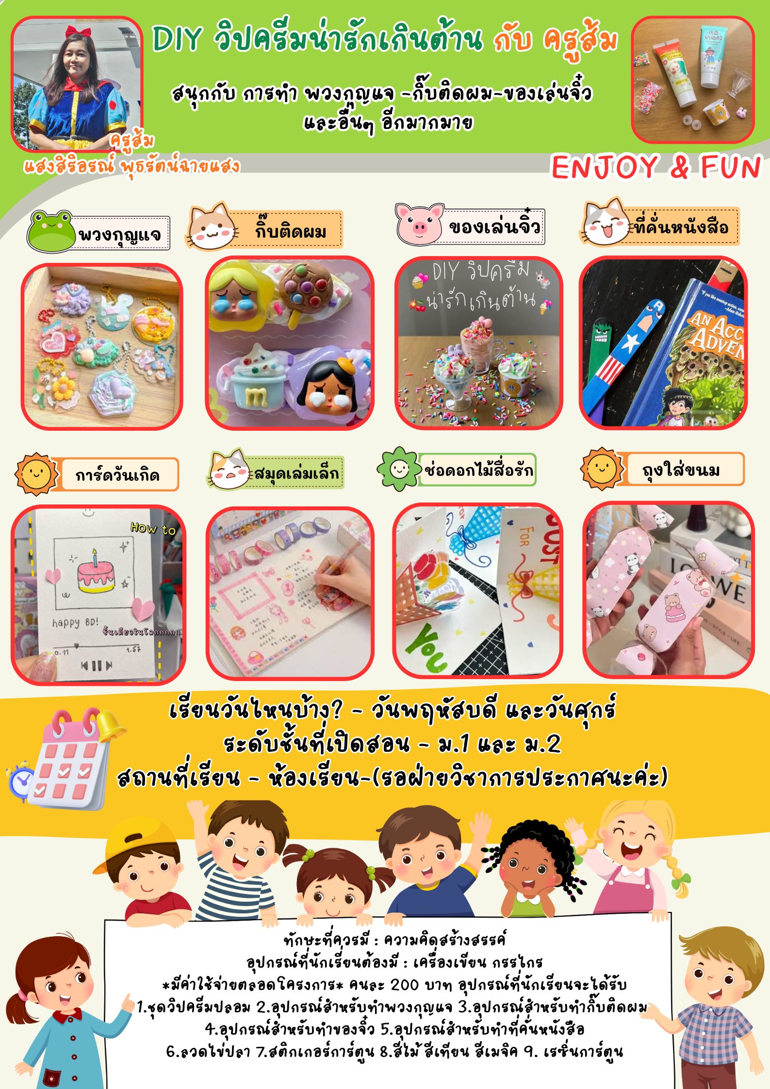 ชื่อวิชา : DIY วิปครีมน่ารักเกินต้าน  กับครูส้ม ครูผู้สอน : แสงสิริอรณ์ พุธรัตน์ฉายแสง ระดับชั้นที่เปิดสอน : ม.1 ม.2 ดูรายละเอียดเพิ่มเติม.. |