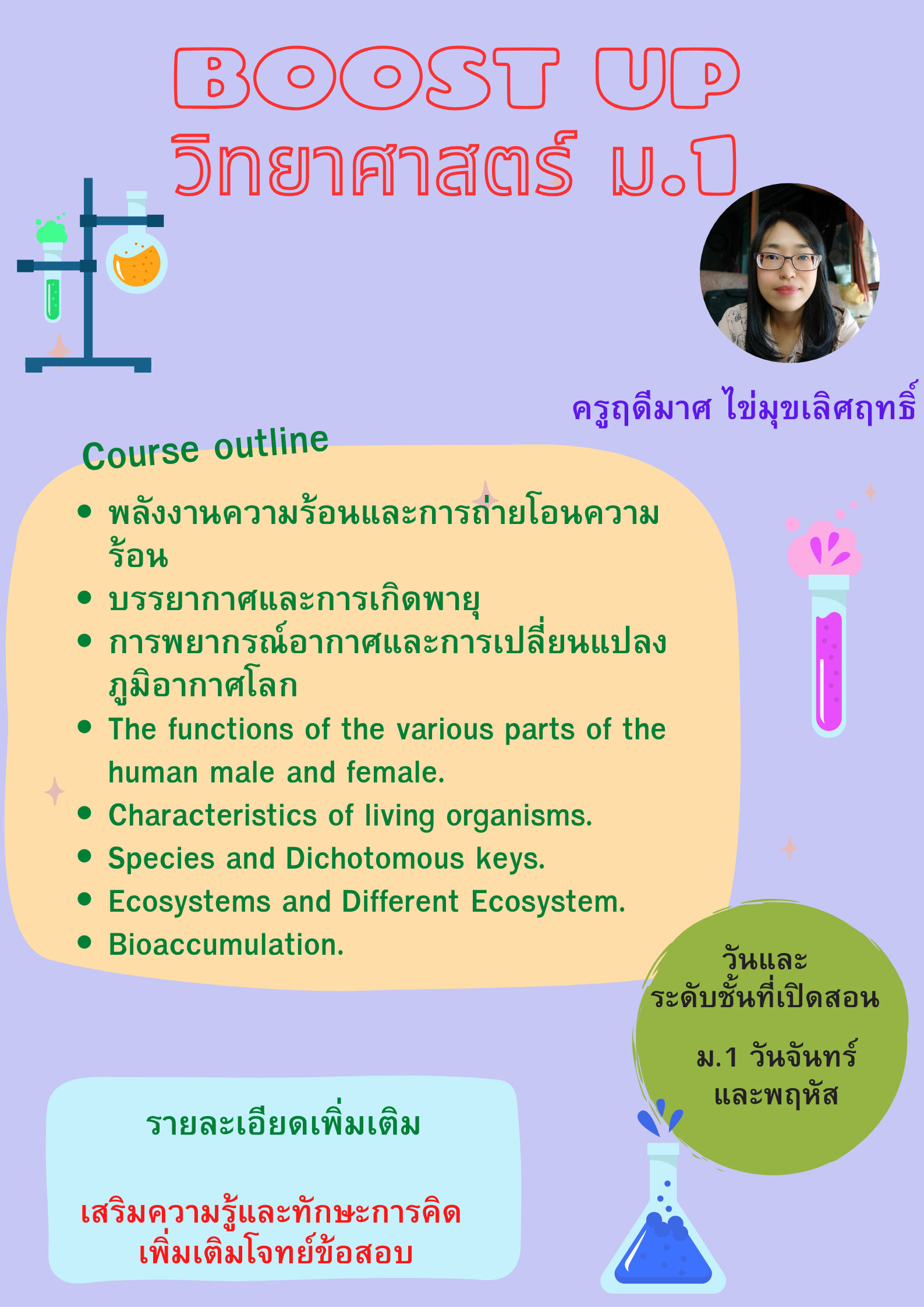 ชื่อวิชา : EASY SCIENCE With KruTOP ครูผู้สอน : ธันย์ณภัทร วรภัฎ ระดับชั้นที่เปิดสอน : ม.2 ดูรายละเอียดเพิ่มเติม.. |