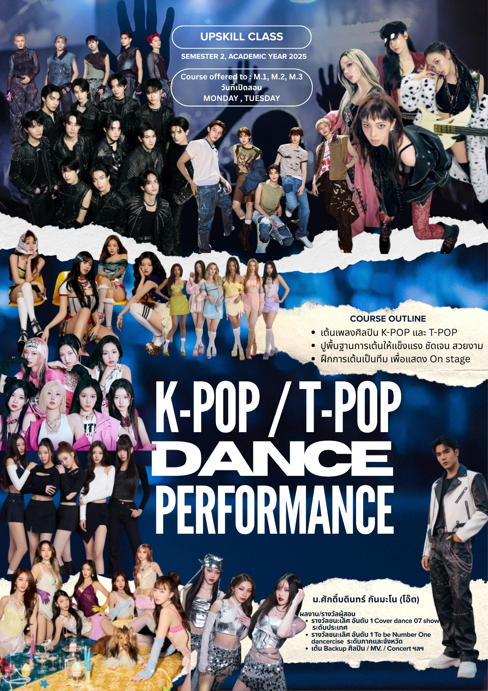ชื่อวิชา : K-POP / T-POP DANCE PERFORMANCE ครูผู้สอน : ศักดิ์บดินทร์ กันมะโน ระดับชั้นที่เปิดสอน : ม.1 ม.2 ม.3 ดูรายละเอียดเพิ่มเติม.. |