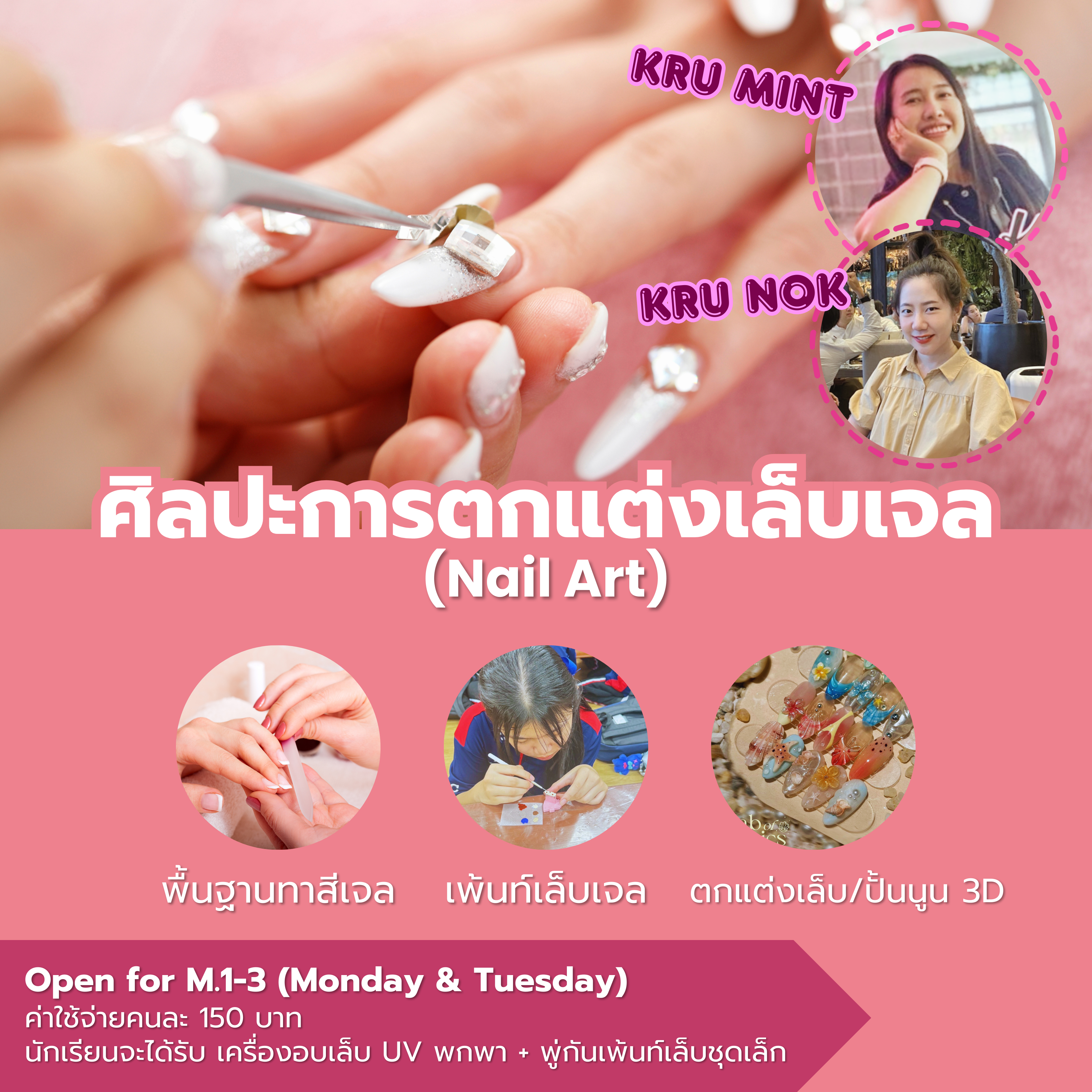 ชื่อวิชา : ศิลปะการตกแต่งเล็บเจล (Nail Art) ครูผู้สอน : ธนัชพร จิตต์ธรรม ระดับชั้นที่เปิดสอน : ม.1 ม.2 ม.3 ดูรายละเอียดเพิ่มเติม.. |
