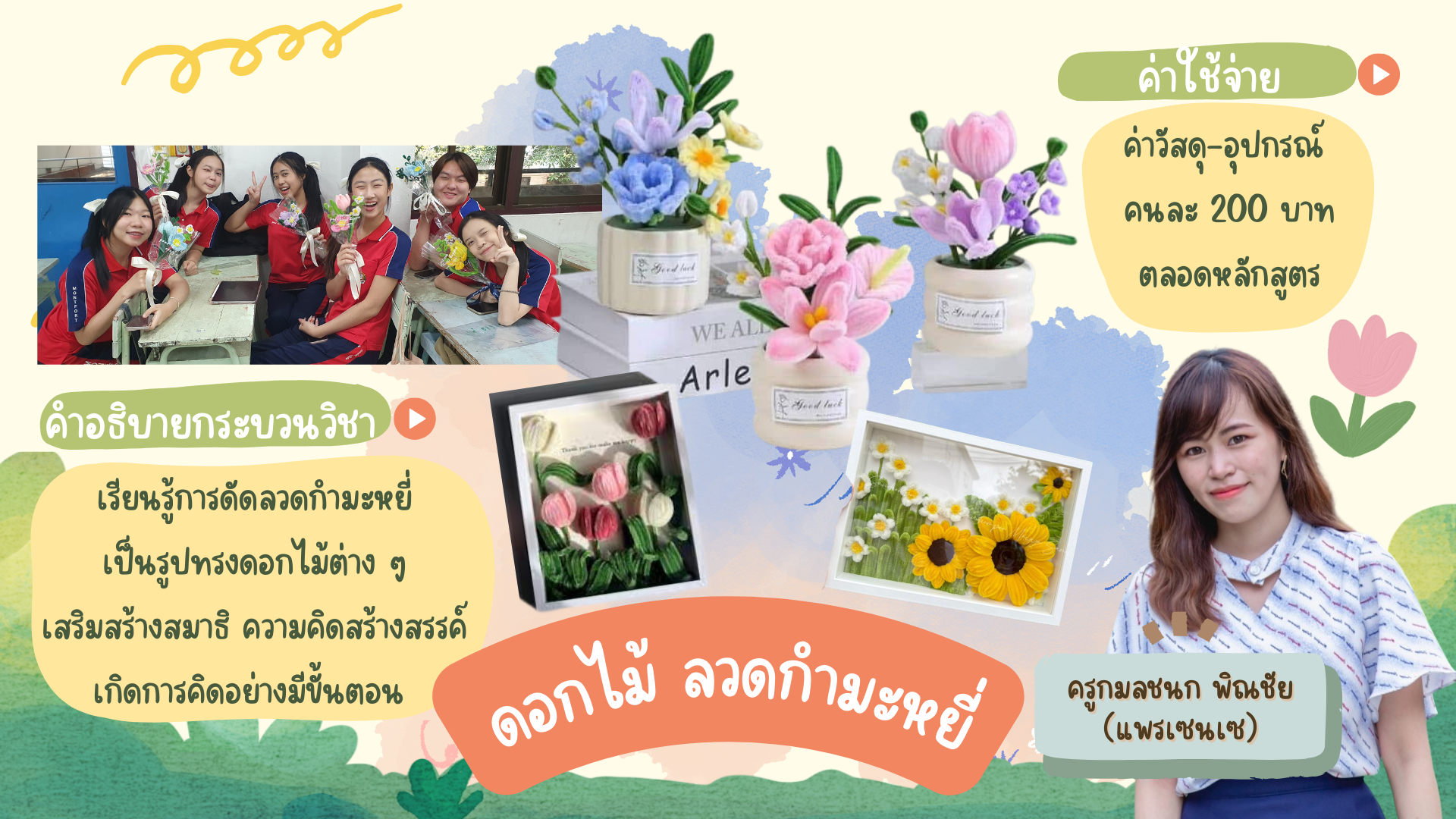 ชื่อวิชา : ดอกไม้ ลวดกำมะหยี่ ครูผู้สอน : กมลชนก พิณชัย ระดับชั้นที่เปิดสอน : ม.1 ม.2 ดูรายละเอียดเพิ่มเติม.. |