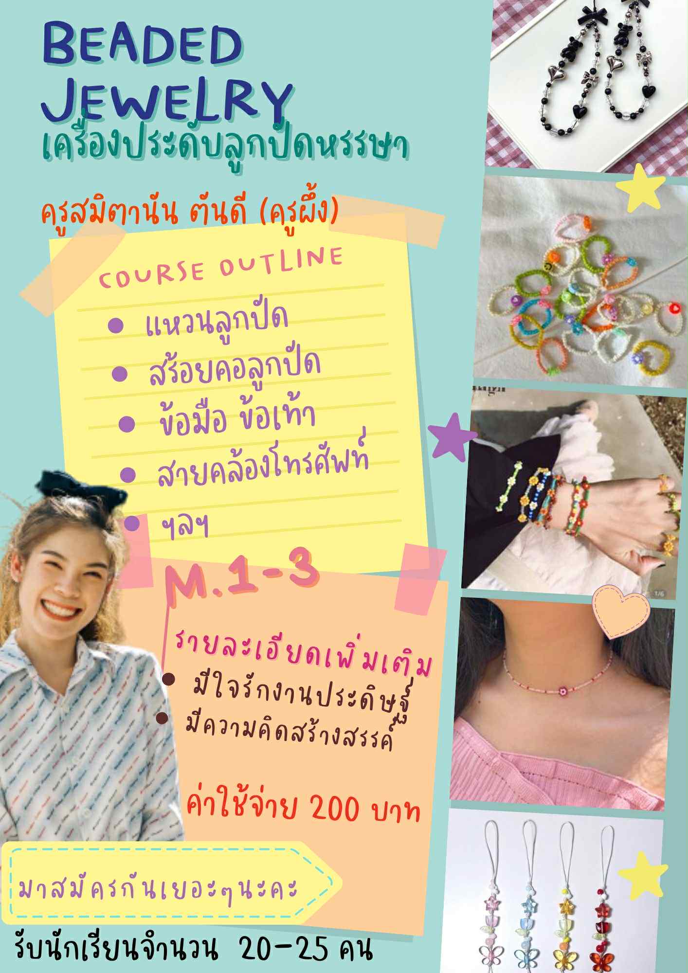 ชื่อวิชา : BEADED JEWELRY เครื่องประดับลูกปัดหรรษา ครูผู้สอน : สมิตานัน ตันดี ระดับชั้นที่เปิดสอน : ม.1 ม.2 ม.3 ดูรายละเอียดเพิ่มเติม.. |