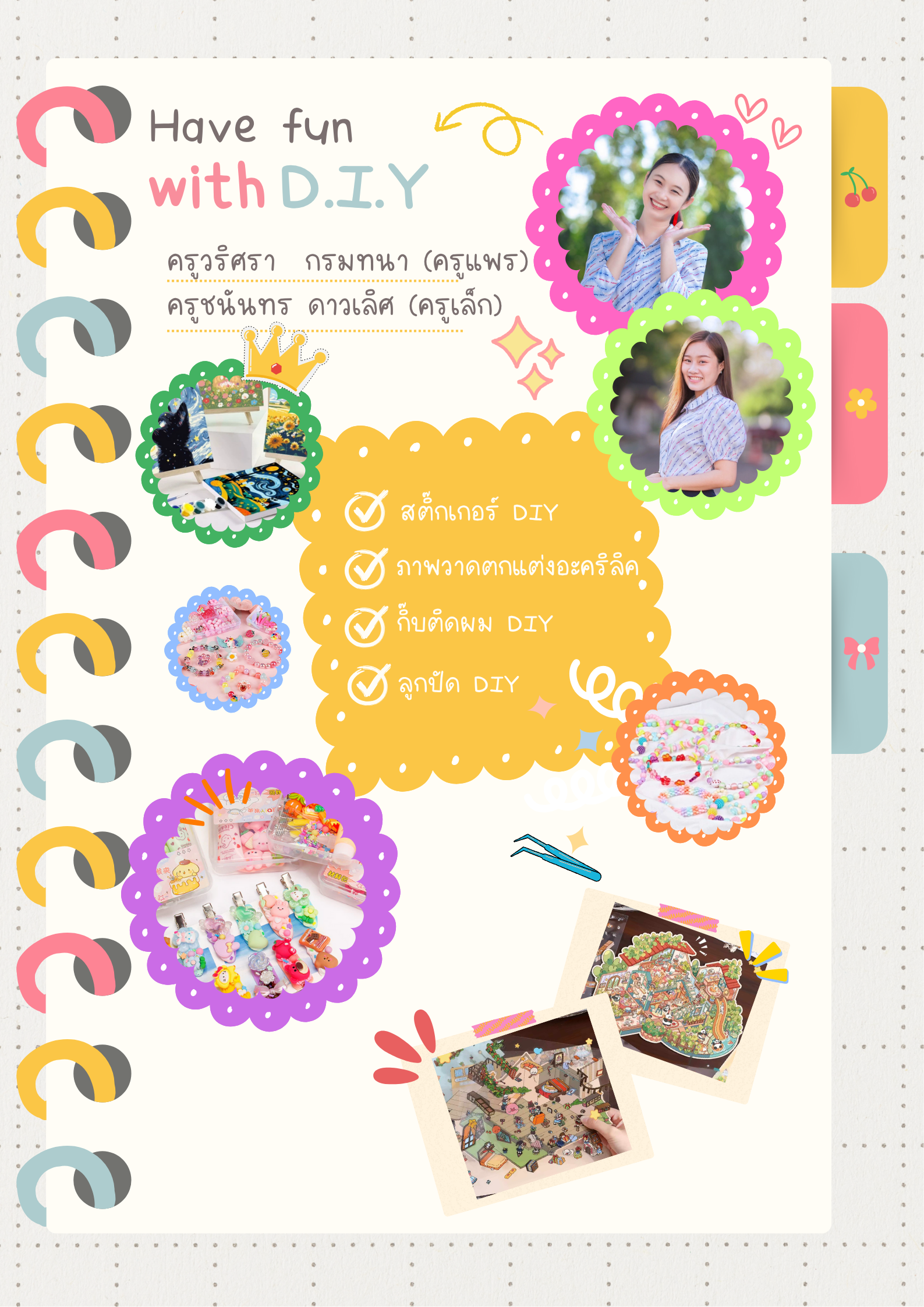 ชื่อวิชา : Have Fun with D.I.Y ครูผู้สอน : ชนันทร ดาวเลิศ ระดับชั้นที่เปิดสอน : ม.1 ม.2 ม.3 ดูรายละเอียดเพิ่มเติม.. |