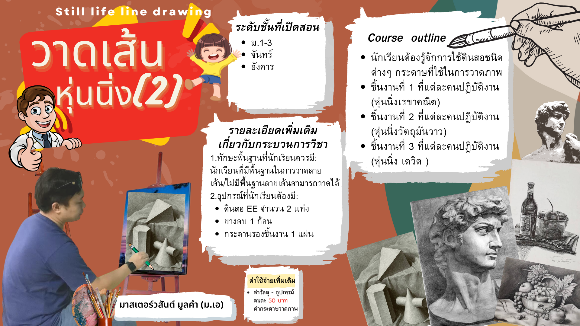 ชื่อวิชา : วาดเส้นหุ่นนิ่ง 2 ครูผู้สอน : วสันต์ มูลคำ ระดับชั้นที่เปิดสอน : ม.1 ม.2 ม.3 ดูรายละเอียดเพิ่มเติม.. |