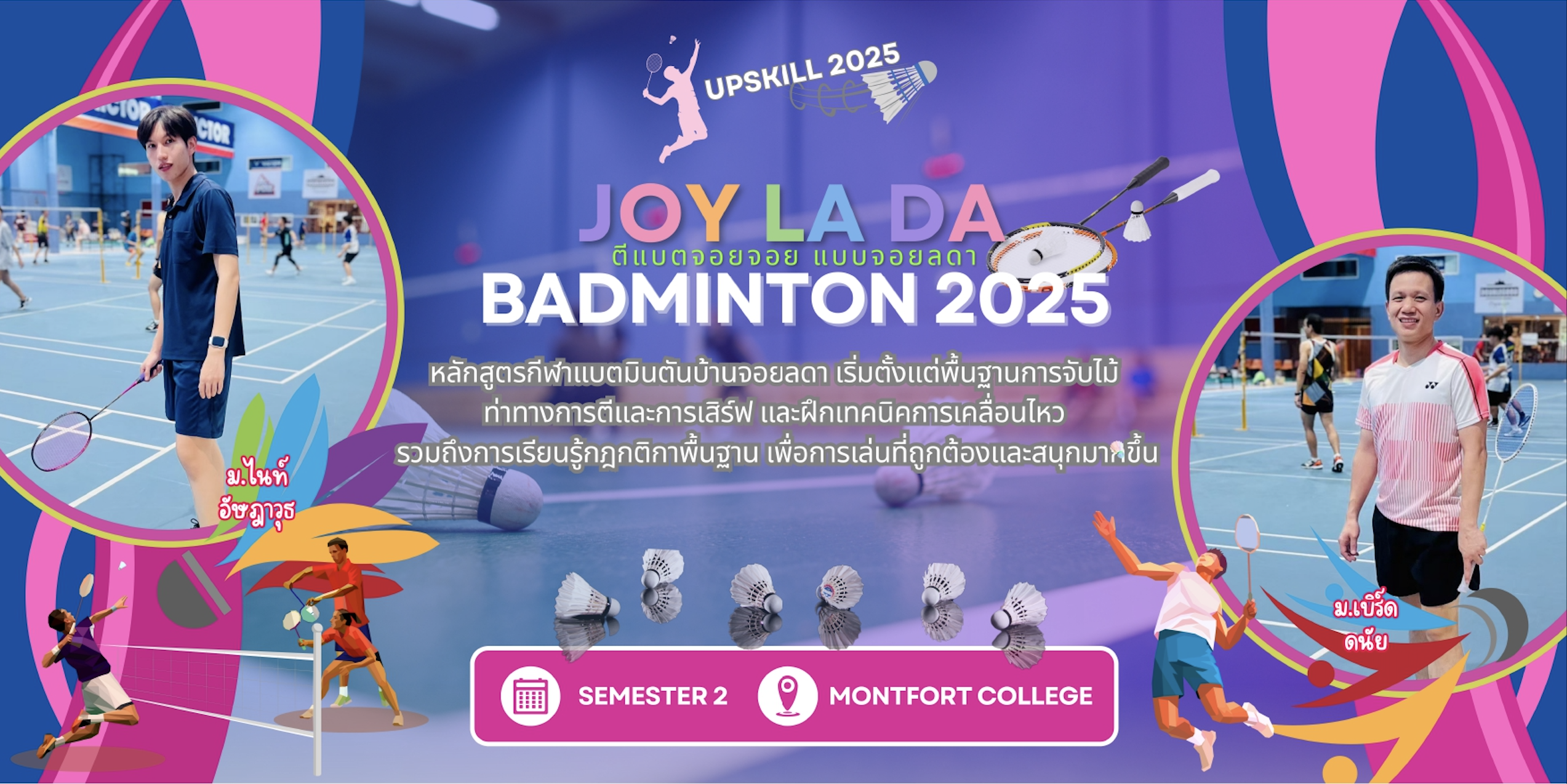 ชื่อวิชา : JOYLADA BADMINTON ตีแบดจอยจอย แบบจอยลดา ครูผู้สอน : อัษฎาวุธ ทวีกุล ระดับชั้นที่เปิดสอน : ม.1 ม.2 ม.3 ดูรายละเอียดเพิ่มเติม.. |