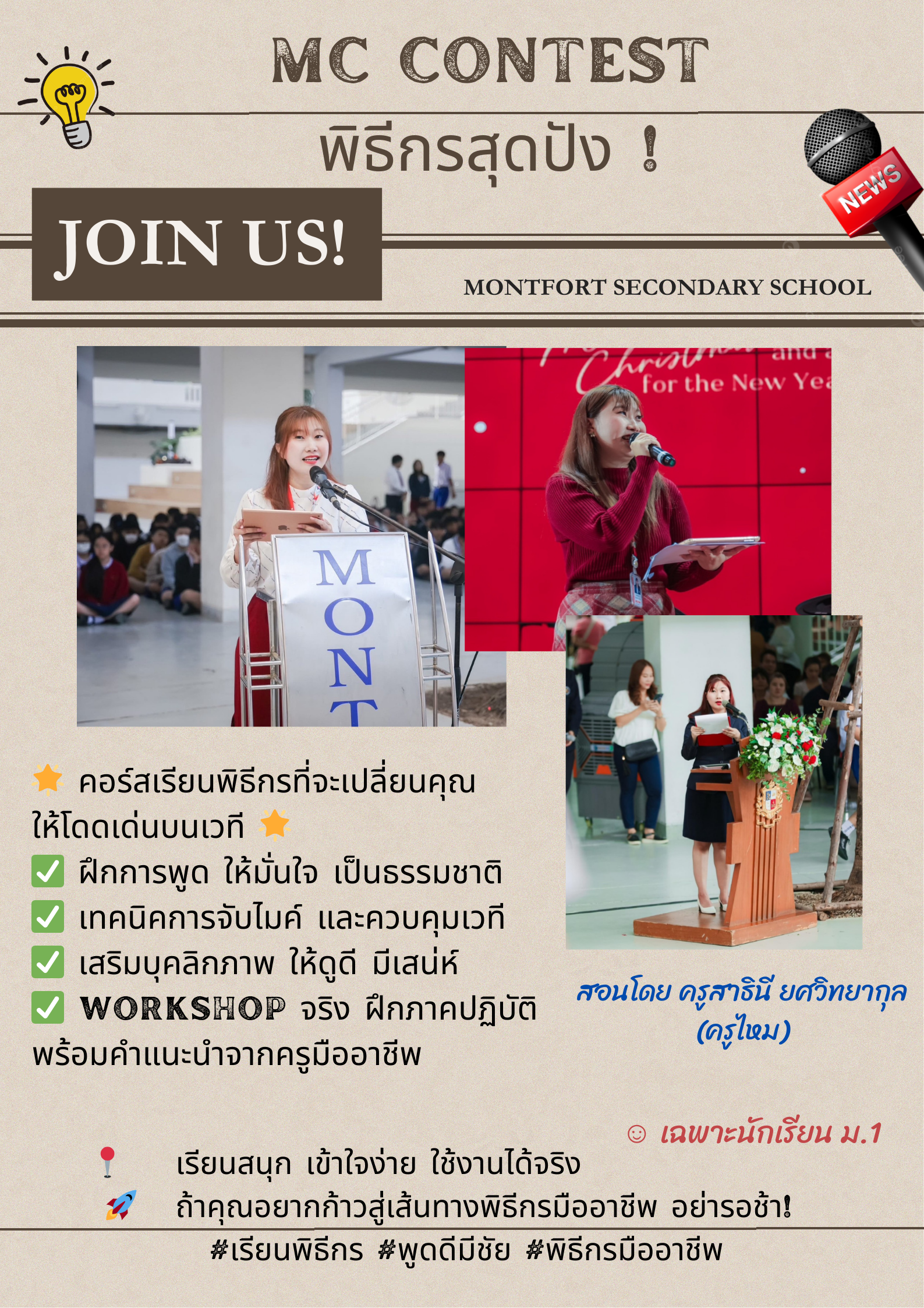 ชื่อวิชา : MC CONTEST พิธีกรสุดปัง! ครูผู้สอน : สาธินี ยศวิทยากุล ระดับชั้นที่เปิดสอน : ม.1 ดูรายละเอียดเพิ่มเติม.. |