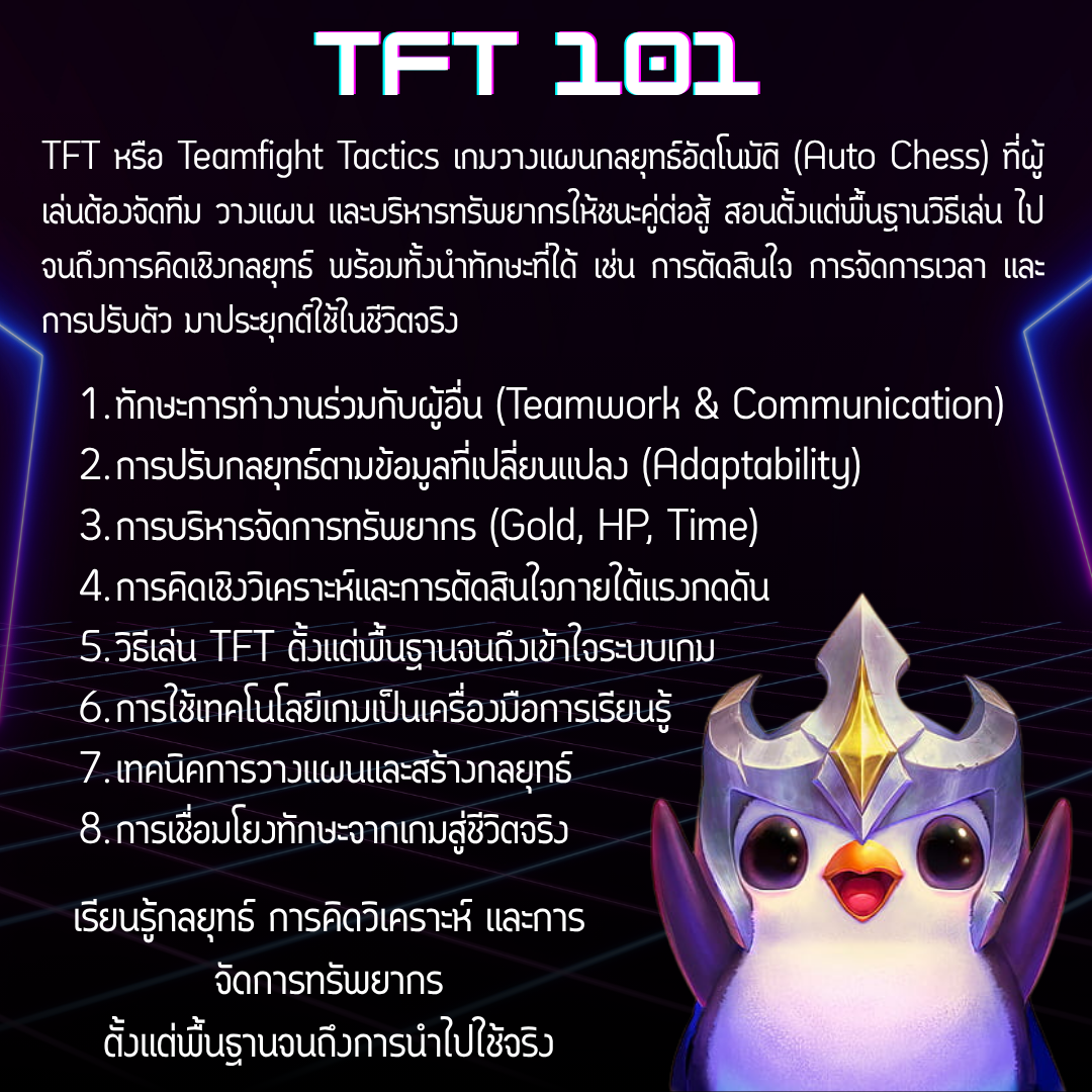 ชื่อวิชา : TFT 101 (Teamfight Tactics) ครูผู้สอน : เกียรติศักดิ์ ธรรมธิ ระดับชั้นที่เปิดสอน : ม.1 ม.2 ดูรายละเอียดเพิ่มเติม.. |