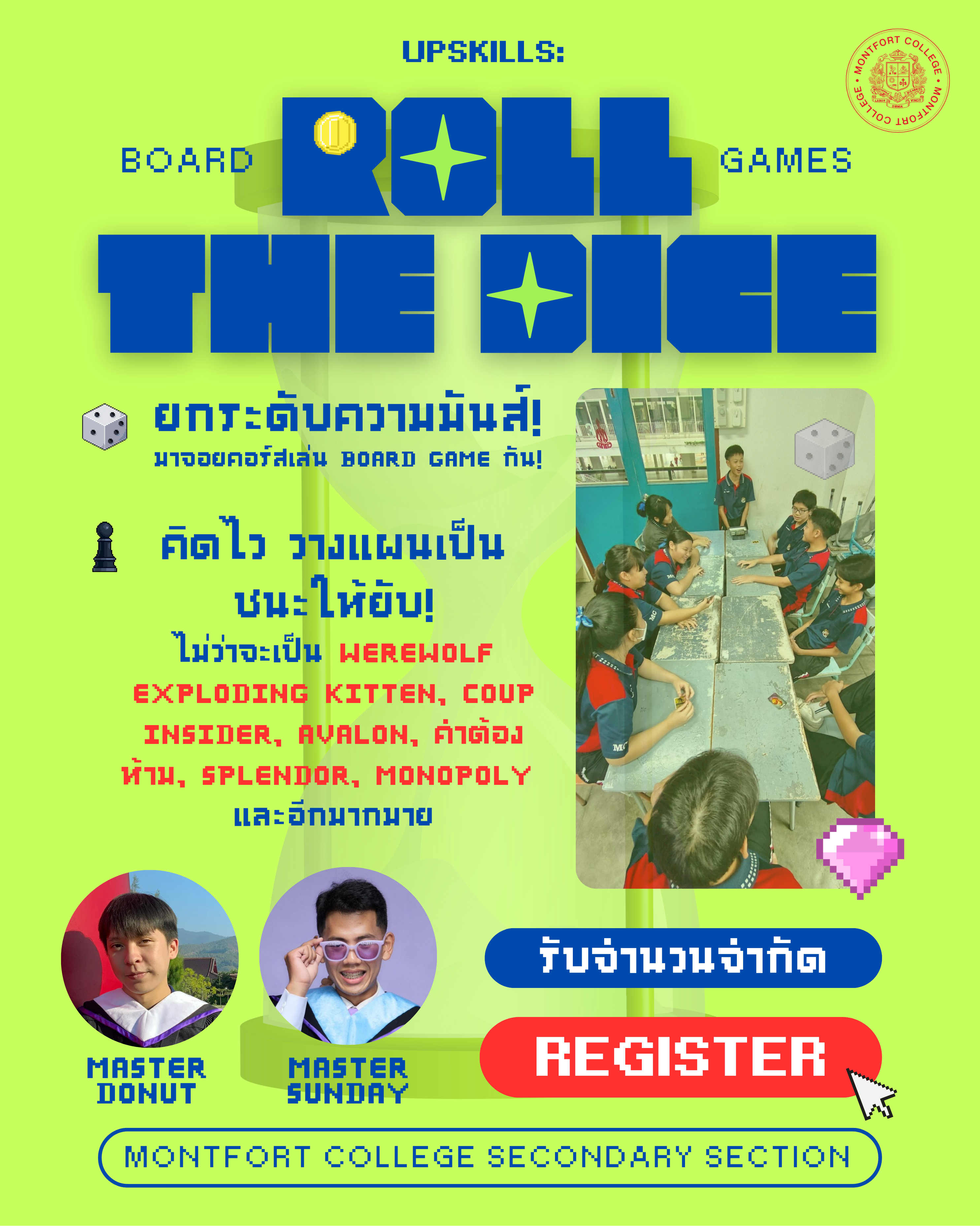 ชื่อวิชา : ROLL THE DICE (Board Games) ครูผู้สอน : พีระนัฐ เผ่าไทย ระดับชั้นที่เปิดสอน : ม.1 ม.2 ม.3 ดูรายละเอียดเพิ่มเติม.. |