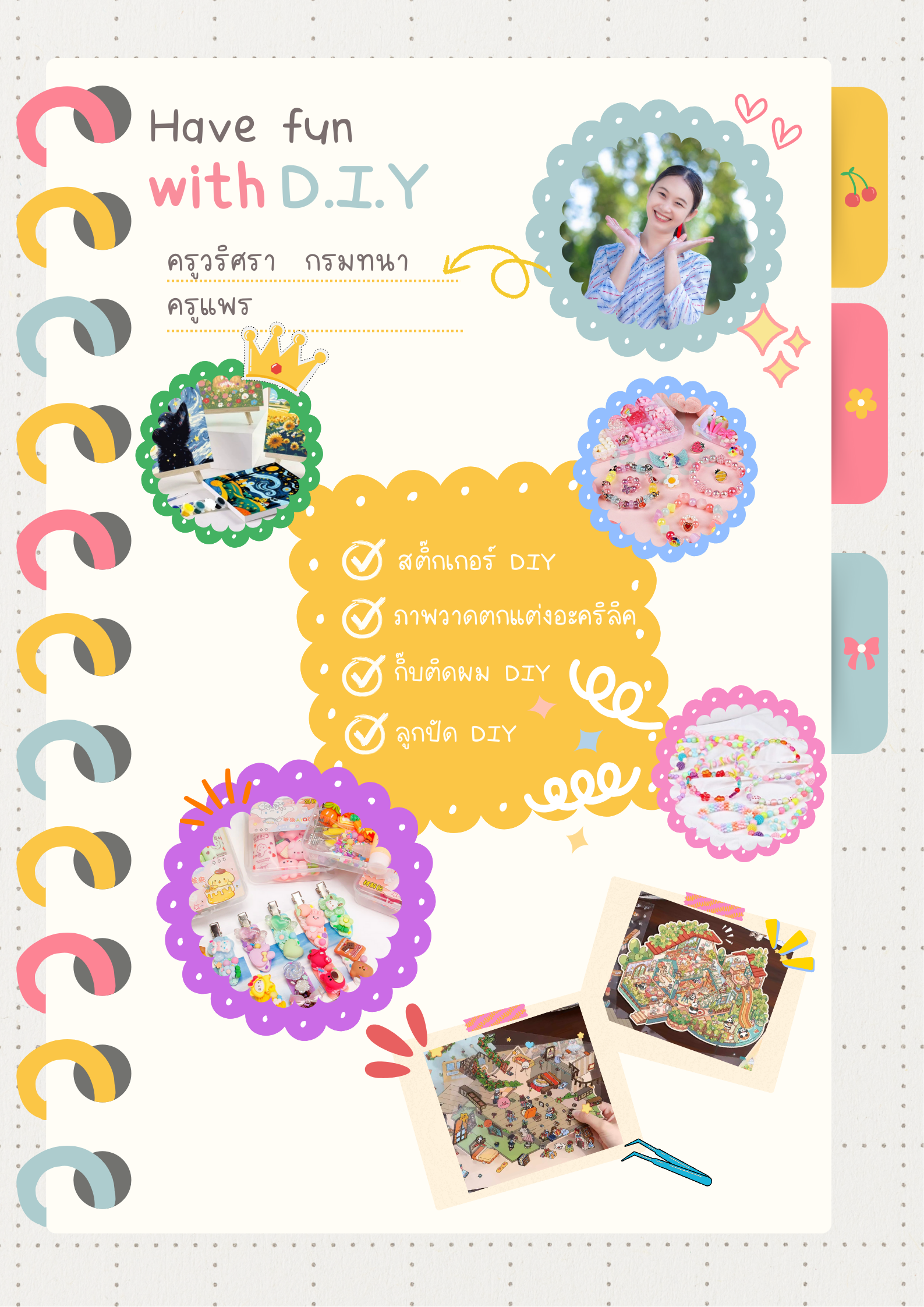 ชื่อวิชา : Have fun with DIY ครูผู้สอน : วริศรา กรมทนา ระดับชั้นที่เปิดสอน : ม.1 ม.2 ดูรายละเอียดเพิ่มเติม.. |
