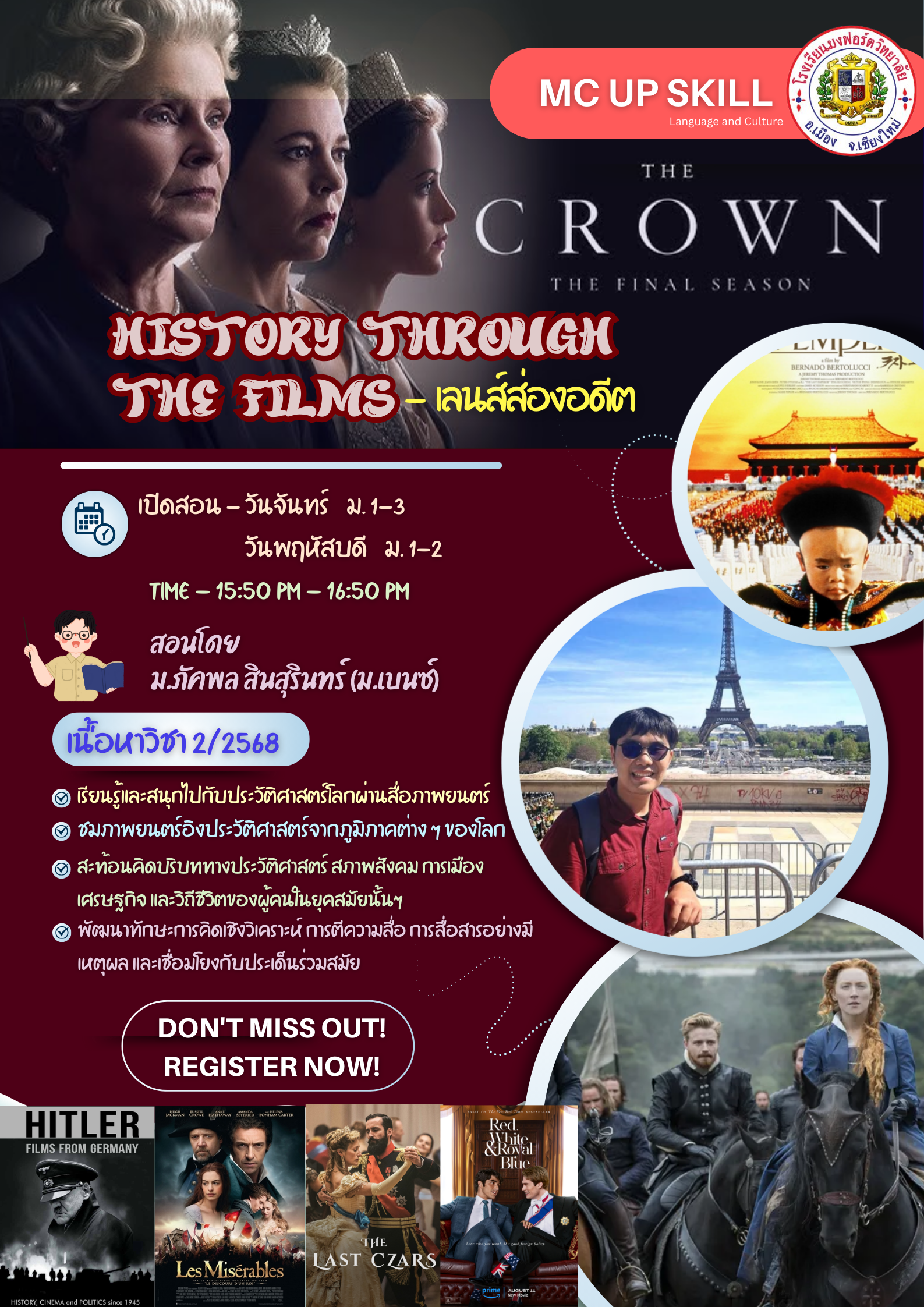 ชื่อวิชา : History through the Films - เลนส์ส่องอดีต ครูผู้สอน : ภัคพล สินสุรินทร์ ระดับชั้นที่เปิดสอน : ม.1 ม.2 ม.3 ดูรายละเอียดเพิ่มเติม.. |