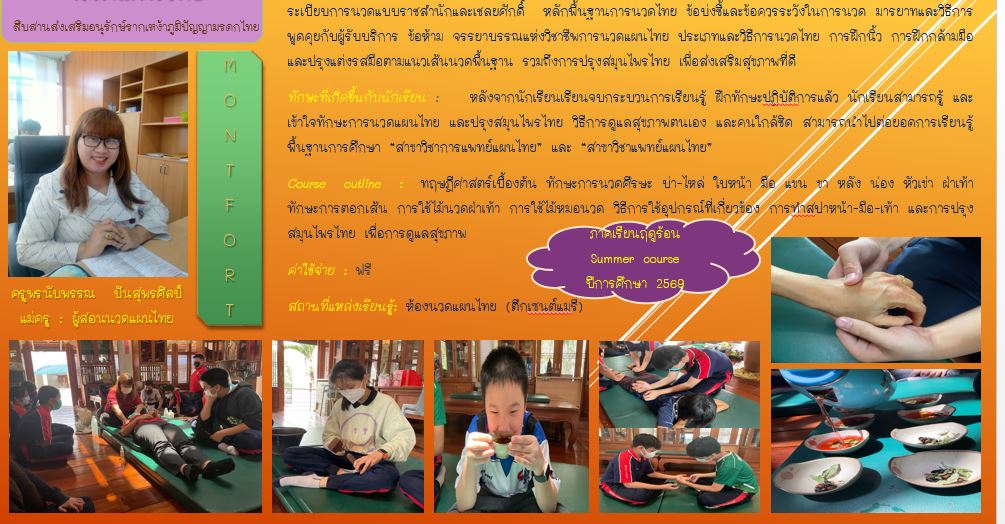 ชื่อวิชา : นวดแผนไทย & ปรุงสมุนไพรไทย ครูผู้สอน : พรนับพรรณ ปันสุพรศิลป์ ระดับชั้นที่เปิดสอน : ม.1 ม.2 ม.3 ม.4 ม.5 ค่าใช้จ่าย : - ดูรายละเอียดเพิ่มเติม.. |