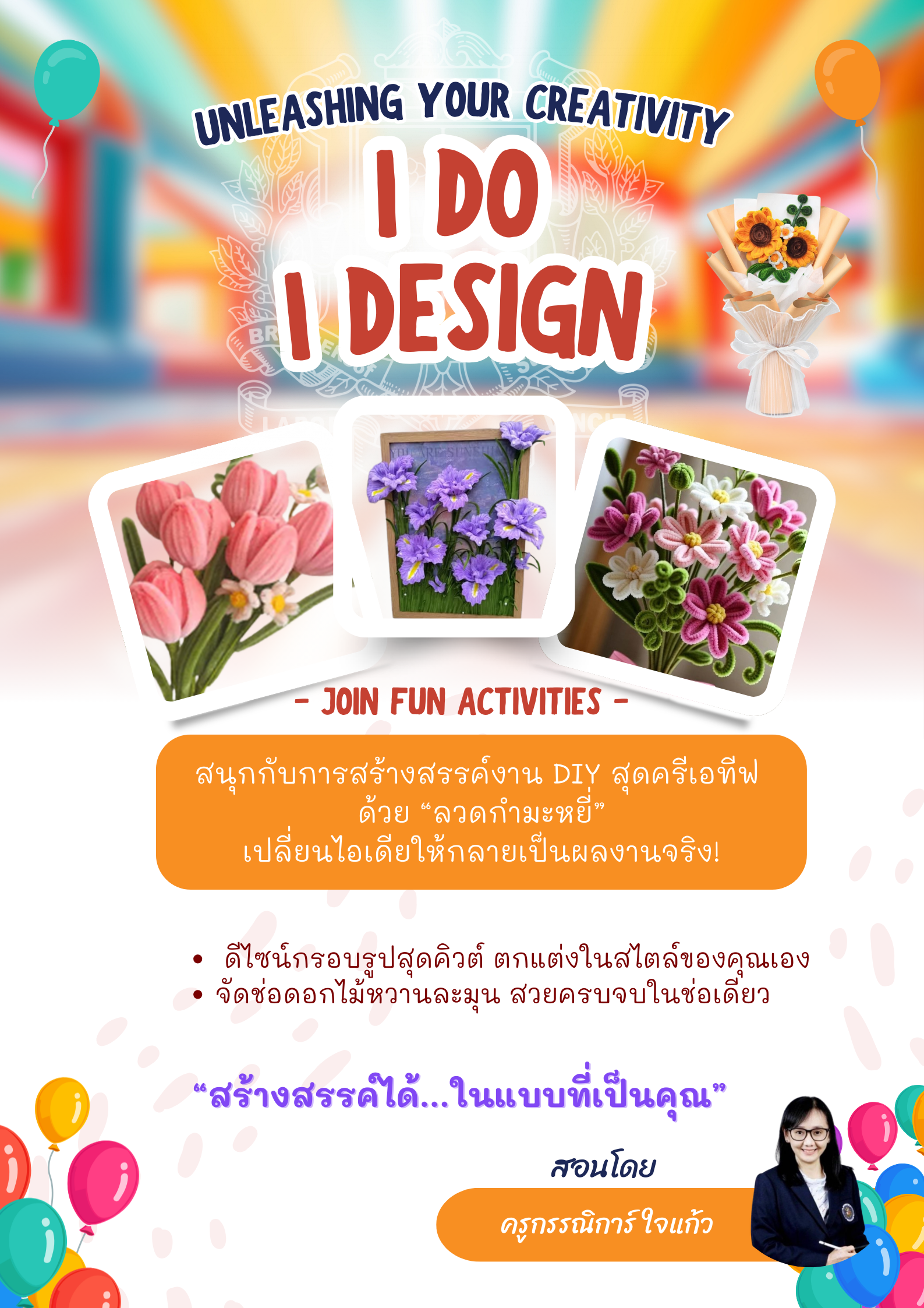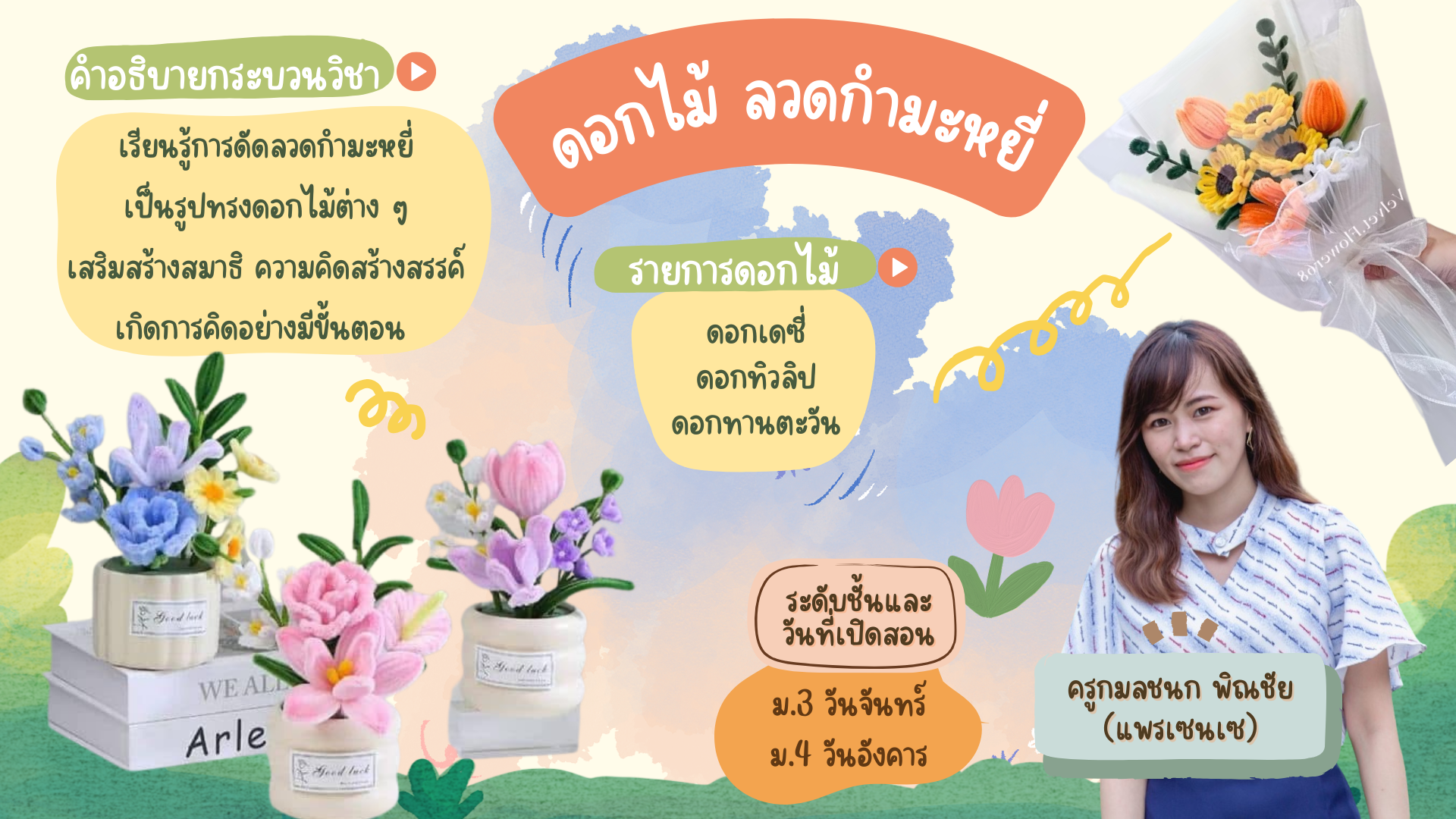 ชื่อวิชา : ช่อดอกไม้กำมะหยี่แสนสวย ครูผู้สอน : สุพิญช์ญา อินนันต์ ระดับชั้นที่เปิดสอน : ม.3 ม.4 ม.5 ค่าใช้จ่าย : - ดูรายละเอียดเพิ่มเติม.. |