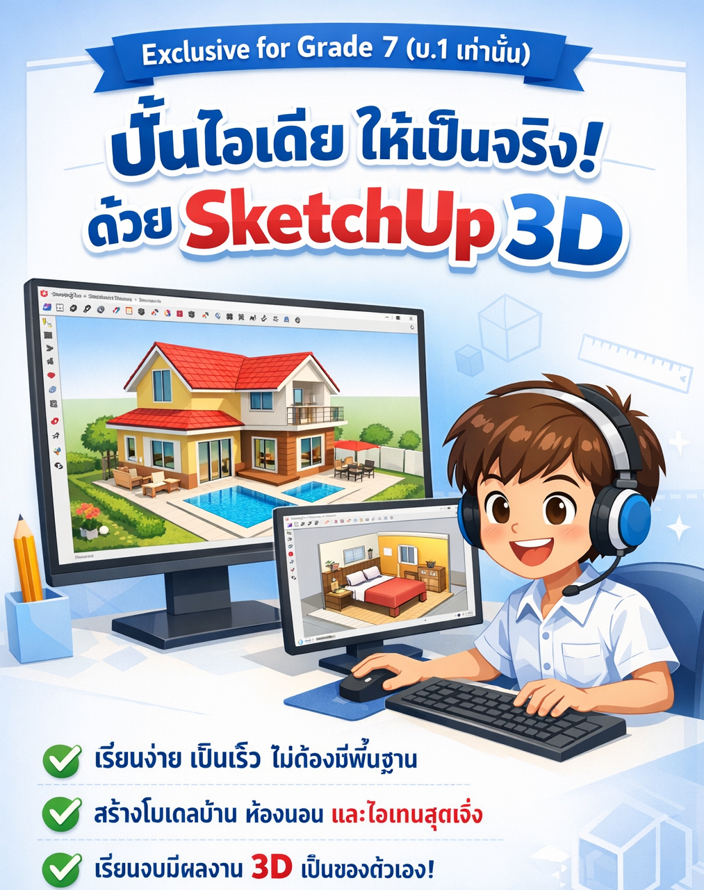ชื่อวิชา : การออกแบบโมเดลต่าง ๆ โดยโปรแกรม sketchup ครูผู้สอน : นัฐวุฒิ ศรีวิเชียร ระดับชั้นที่เปิดสอน : ม.1 ค่าใช้จ่าย : - ดูรายละเอียดเพิ่มเติม.. |