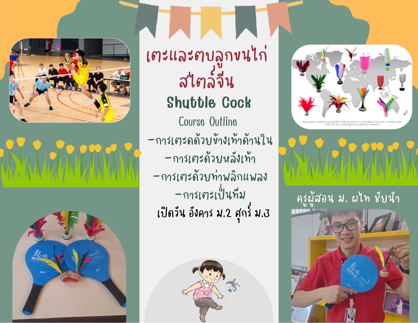 ชื่อวิชา : เตะและตบ ลูกขนไก่ style จีน ครูผู้สอน : ผไท ชัยนำ ระดับชั้นที่เปิดสอน : ม.2 ม.3 ค่าใช้จ่าย : - ดูรายละเอียดเพิ่มเติม.. |