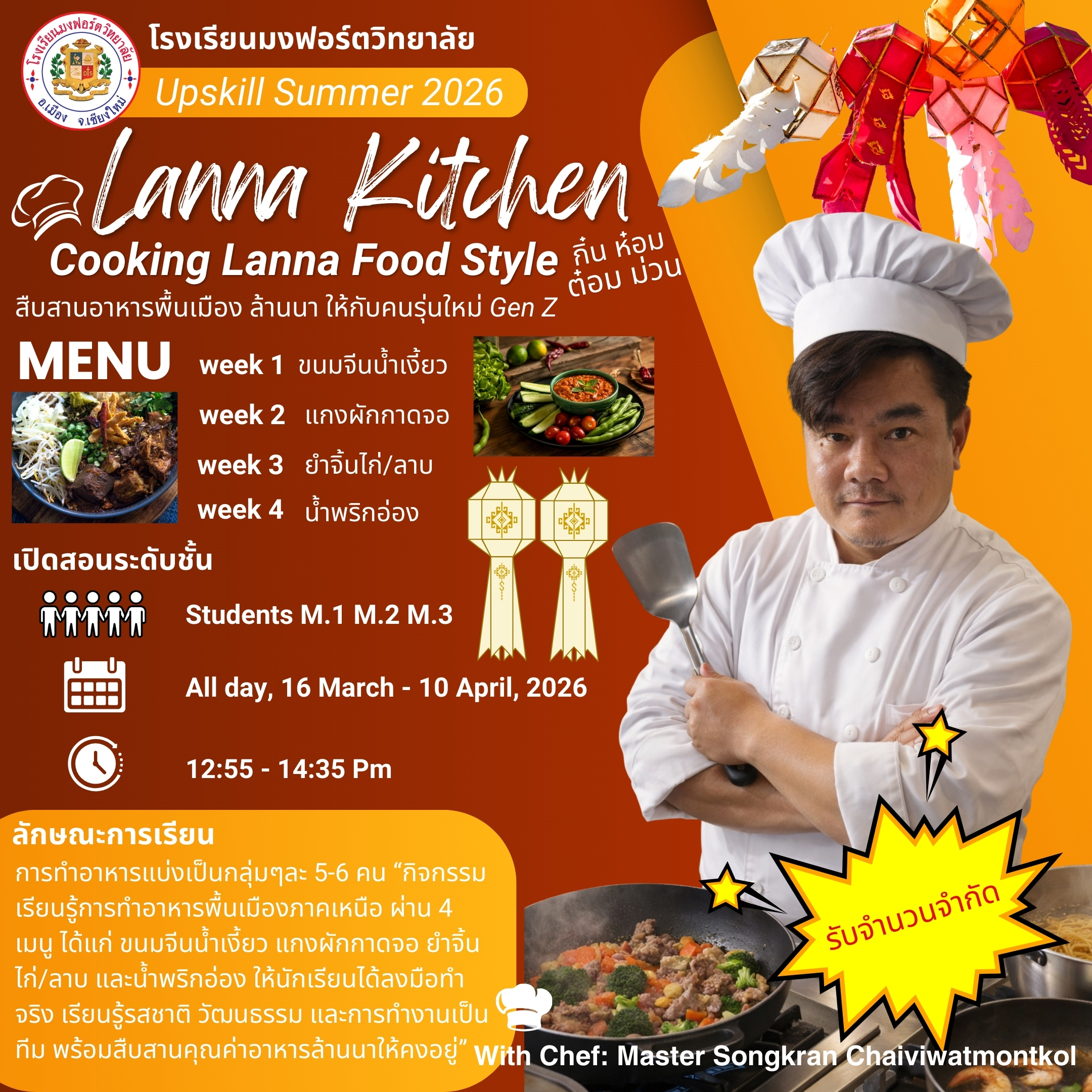 ชื่อวิชา : Lanna Kitchen กิ๋น ห๋อม ต๋อม ม่วน ครูผู้สอน : สงกรานต์ ไชยวิวัฒน์มงคล ระดับชั้นที่เปิดสอน : ม.1 ม.2 ม.3 ค่าใช้จ่าย : - ดูรายละเอียดเพิ่มเติม.. |