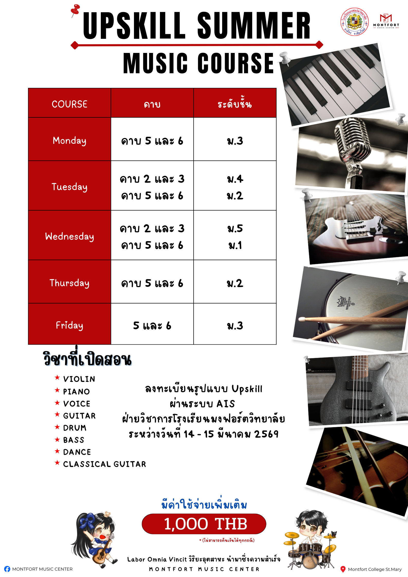 ชื่อวิชา : กีตาร์ (GUITAR) & กีตาร์ไฟฟ้า (Electric GUITAR) ศูนย์ดนตรี ครูผู้สอน : ศุภกิจ สุบินมิตร์ ระดับชั้นที่เปิดสอน : ม.1 ม.2 ม.3 ม.4 ม.5 ค่าใช้จ่าย : 1000 ดูรายละเอียดเพิ่มเติม.. |