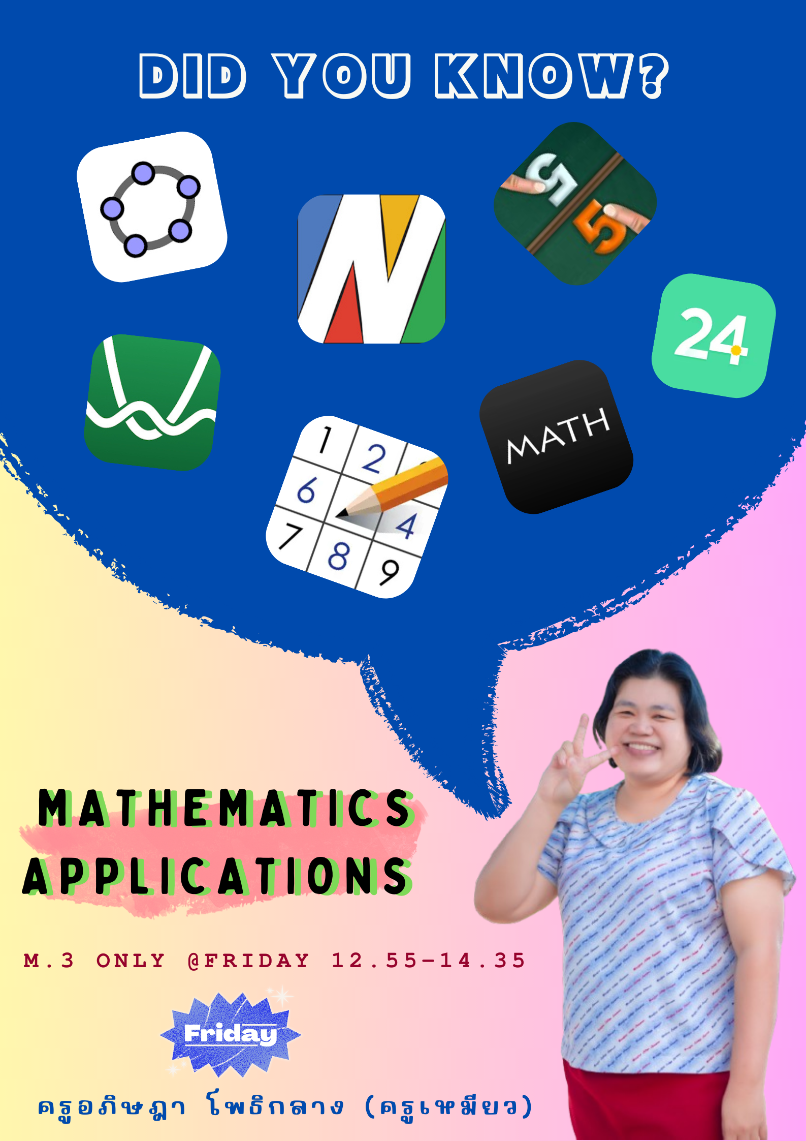 ชื่อวิชา : Mathematics Applications ครูผู้สอน : อภิษฎา โพธิกลาง ระดับชั้นที่เปิดสอน : ม.3 ค่าใช้จ่าย : - ดูรายละเอียดเพิ่มเติม.. |