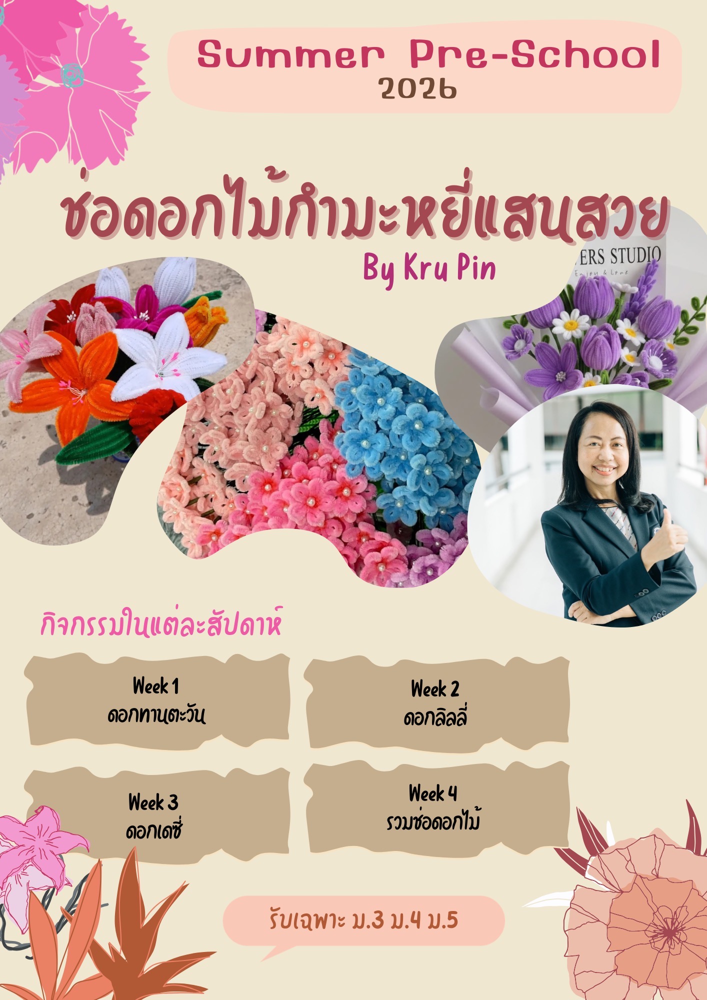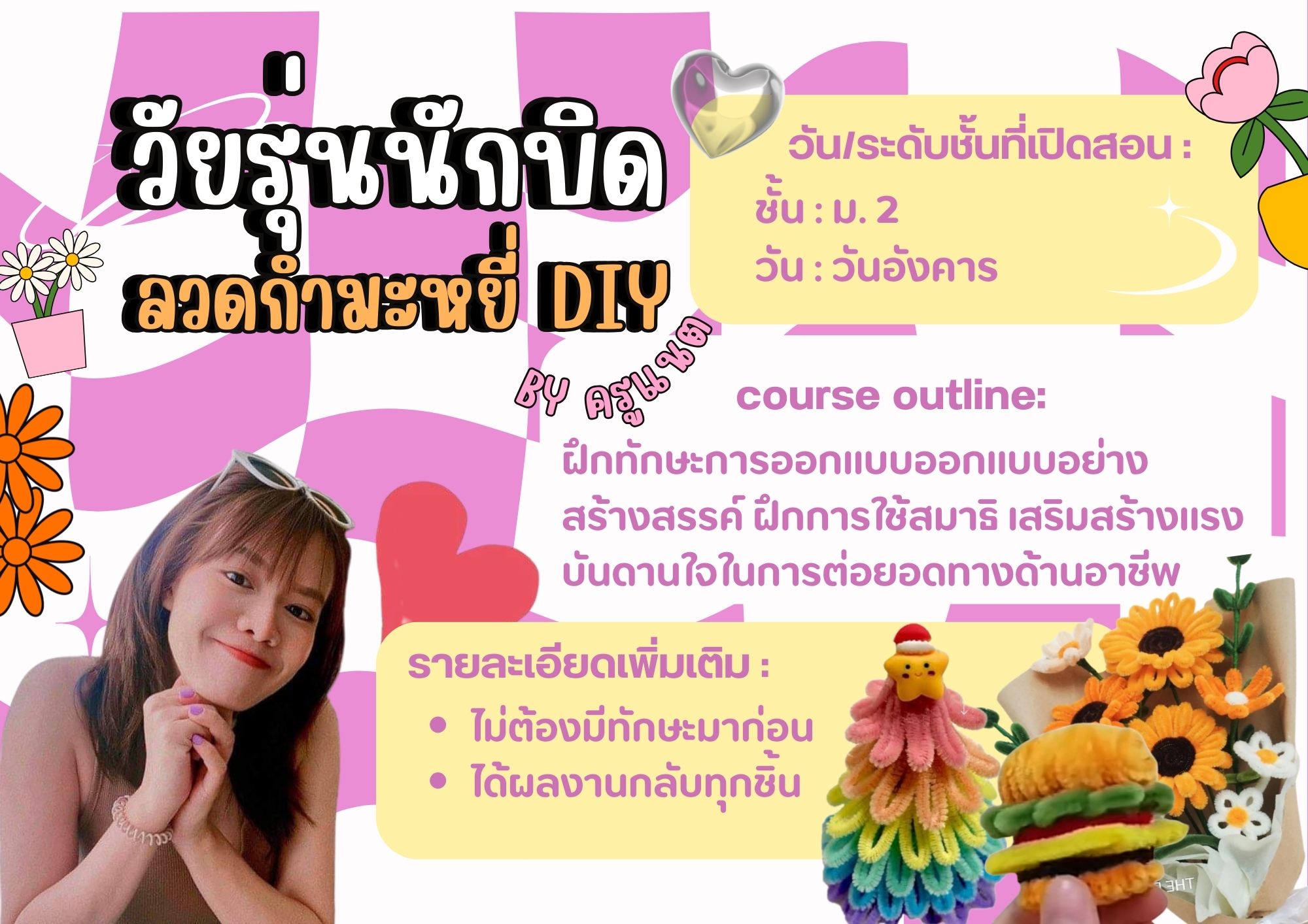 ชื่อวิชา : ดอกไม้ ลวดกำมะหยี่ ครูผู้สอน : กมลชนก พิณชัย ระดับชั้นที่เปิดสอน : ม.3 ม.4 ค่าใช้จ่าย : - ดูรายละเอียดเพิ่มเติม.. |