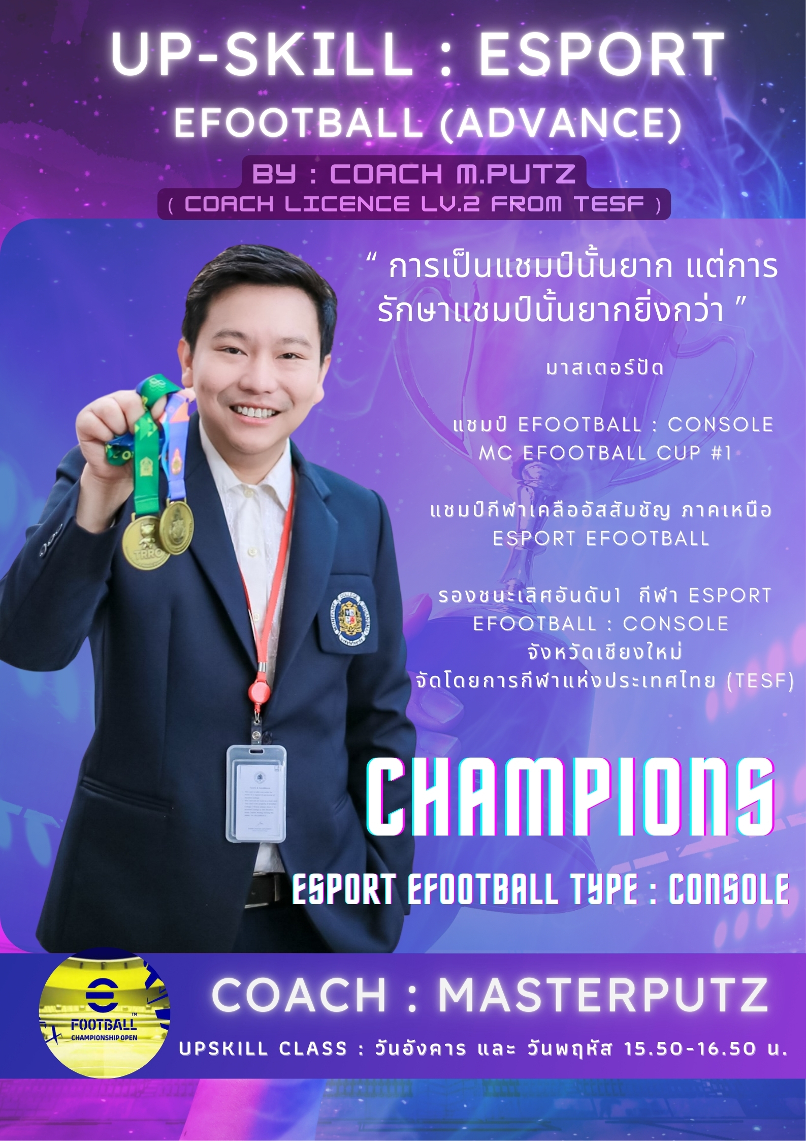 ชื่อวิชา : Esport Efootball (Advance) : The Way of Champions ครูผู้สอน : เจตนิพิฐ วิชาอัครวิทย์ ระดับชั้นที่เปิดสอน : ม.1 ม.2 ม.3 ค่าใช้จ่าย : - ดูรายละเอียดเพิ่มเติม.. |