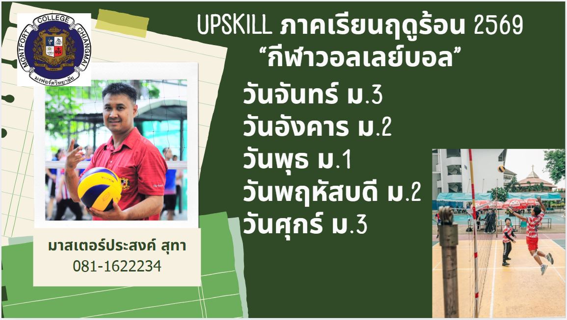 ชื่อวิชา : วอลเลย์บอล ครูผู้สอน : ประสงค์ สุทา ระดับชั้นที่เปิดสอน : ม.1 ม.2 ม.3 ค่าใช้จ่าย : - ดูรายละเอียดเพิ่มเติม.. |