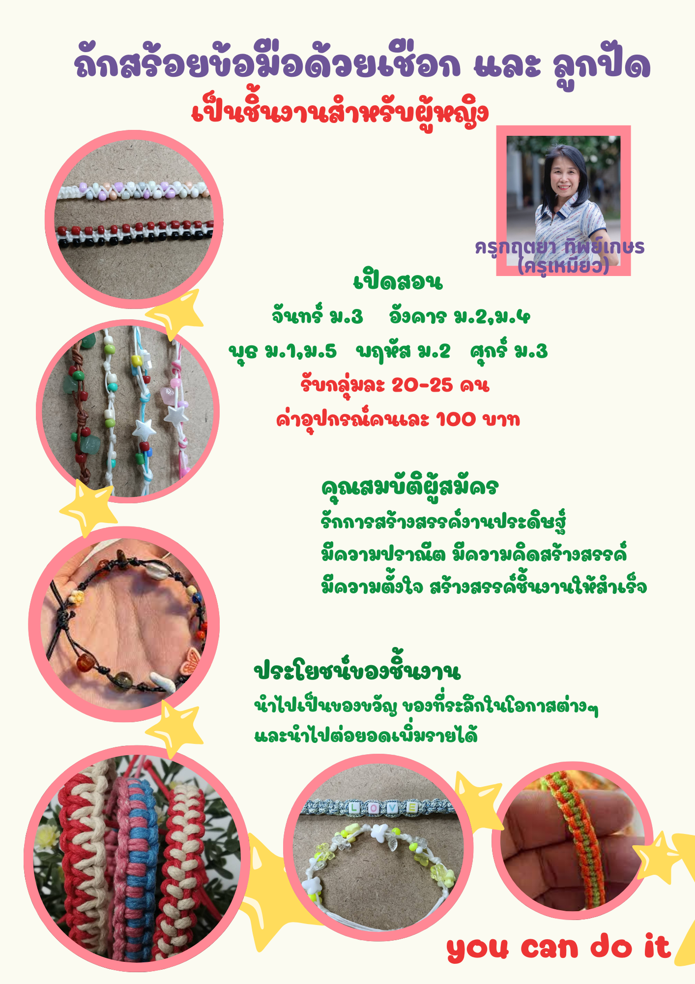 ชื่อวิชา : ถักสร้อยข้อมือด้วยเชือก และ ลุกปัด ครูผู้สอน : กฤตยา ทิพย์เกษร ระดับชั้นที่เปิดสอน : ม.1 ม.2 ม.3 ม.4 ม.5 ค่าใช้จ่าย : - ดูรายละเอียดเพิ่มเติม.. |