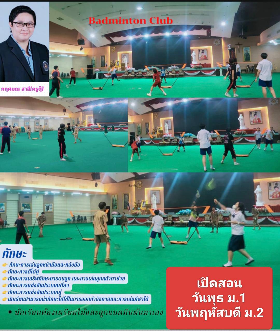 ชื่อวิชา : Badminton Club ครูผู้สอน : กฤศมณ สาสี ระดับชั้นที่เปิดสอน : ม.1 ม.2 ค่าใช้จ่าย : - ดูรายละเอียดเพิ่มเติม.. |
