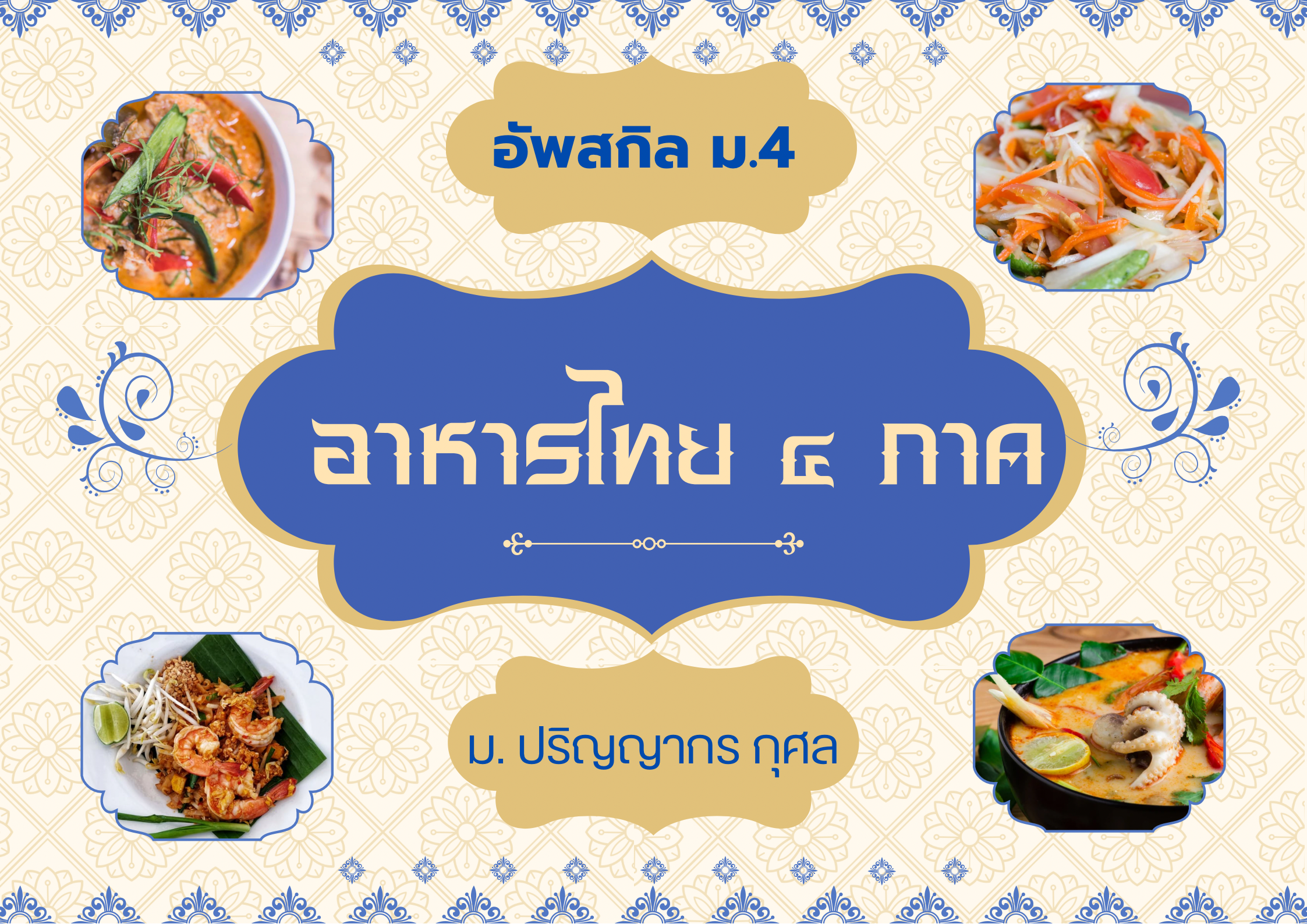 ชื่อวิชา : อาหารไทย 4 ภาค ครูผู้สอน : ปริญญากร กุศล ระดับชั้นที่เปิดสอน : ม.4 ค่าใช้จ่าย : - ดูรายละเอียดเพิ่มเติม.. |
