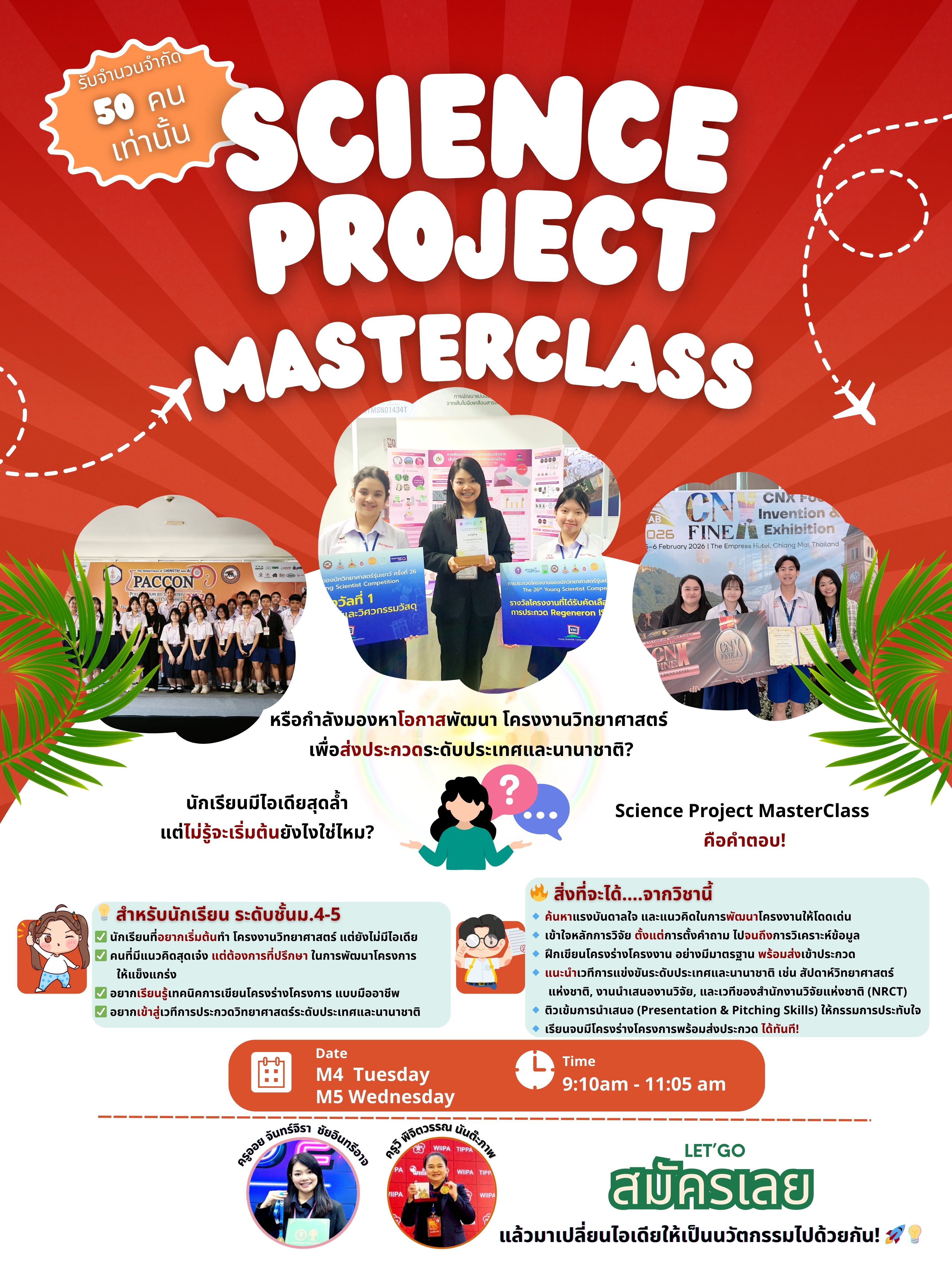 ชื่อวิชา : Go Beyond Project : ปั้นโครงงานสู่เวทีระดับชาติ–นานาชาติ ครูผู้สอน : วารุณี ณ ลำปาง ระดับชั้นที่เปิดสอน : ม.4 ม.5 ค่าใช้จ่าย : - ดูรายละเอียดเพิ่มเติม.. |
