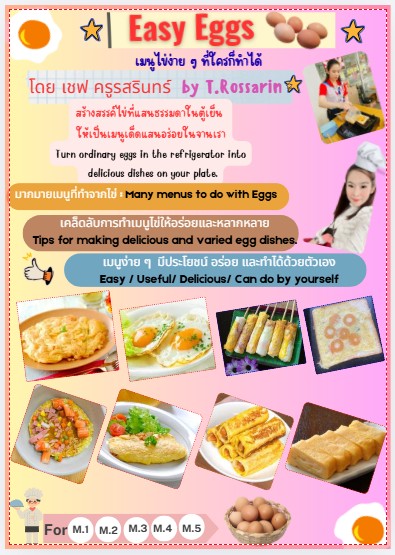 ชื่อวิชา : Easy Eggs (เมนูไข่ง่าย ๆ ที่ใครก็ทำได้) ครูผู้สอน : รสรินทร์ รตนประภา ระดับชั้นที่เปิดสอน : ม.1 ม.2 ม.3 ม.4 ม.5 ค่าใช้จ่าย : - ดูรายละเอียดเพิ่มเติม.. |