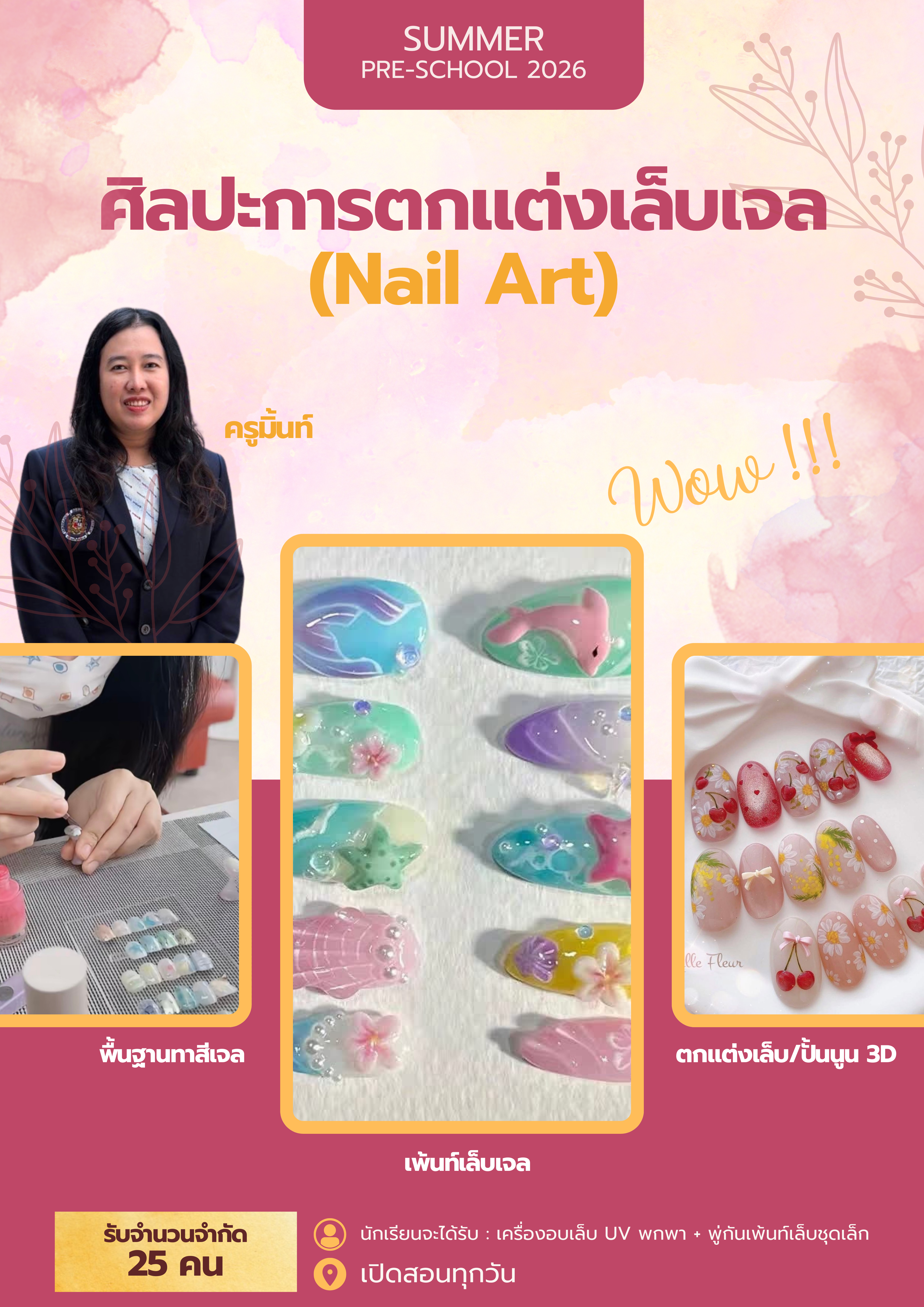 ชื่อวิชา : ศิลปะการตกแต่งเล็บเจล (Nail Art) ครูผู้สอน : ธนัชพร จิตต์ธรรม ระดับชั้นที่เปิดสอน : ม.4 ม.5 ค่าใช้จ่าย : - ดูรายละเอียดเพิ่มเติม.. |