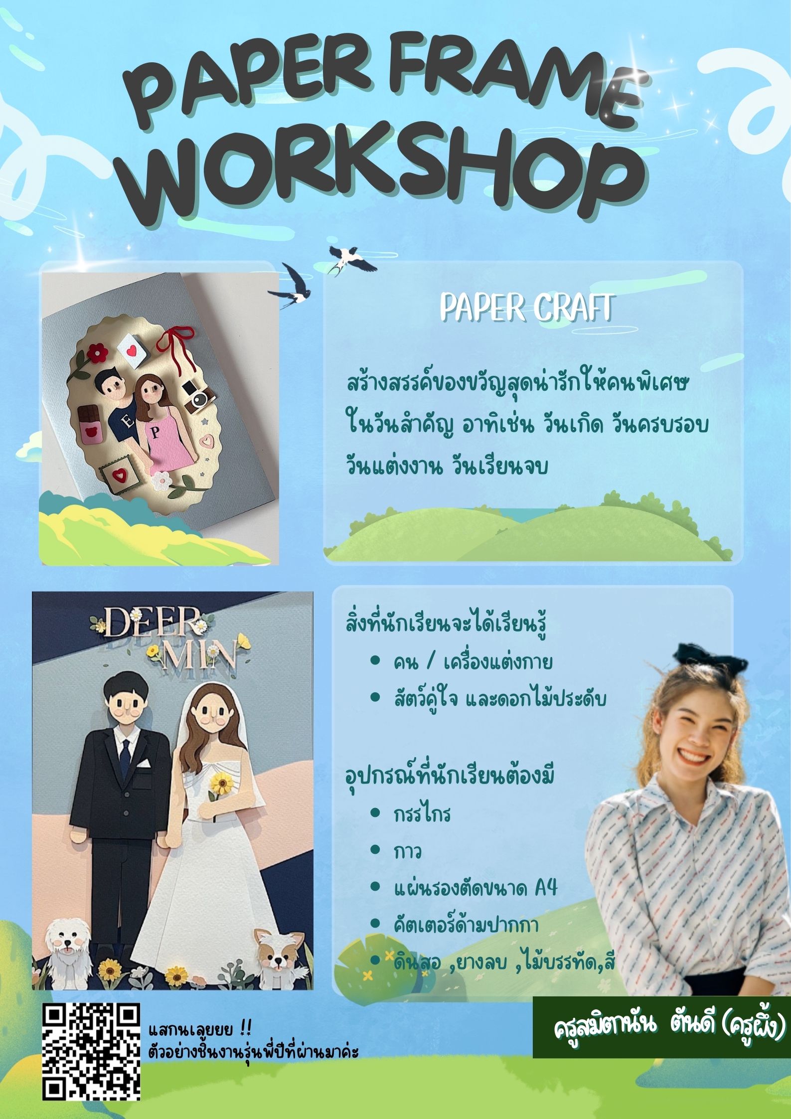 ชื่อวิชา : Paper frame workshop ครูผู้สอน : สมิตานัน ตันดี ระดับชั้นที่เปิดสอน : ม.1 ม.2 ม.3 ม.4 ม.5 ค่าใช้จ่าย : - ดูรายละเอียดเพิ่มเติม.. |