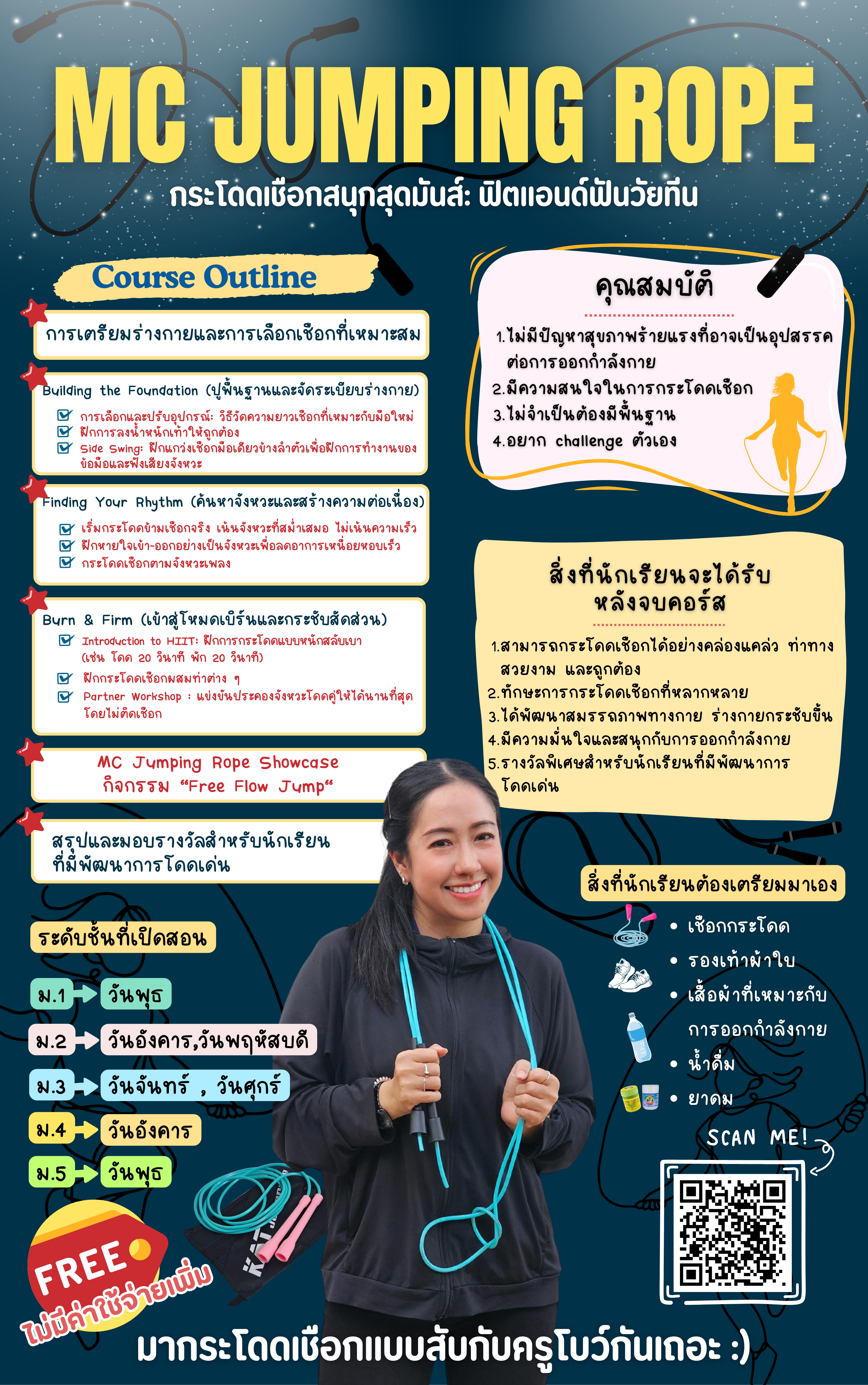 ชื่อวิชา : MC Jumping Rope : กระโดดเชือกสนุกสุดมันส์ ฟิตแอนด์ฟันวัยทีน ครูผู้สอน : ชลิกา ฮีมินกูล ระดับชั้นที่เปิดสอน : ม.1 ม.2 ม.3 ม.4 ม.5 ค่าใช้จ่าย : - ดูรายละเอียดเพิ่มเติม.. |